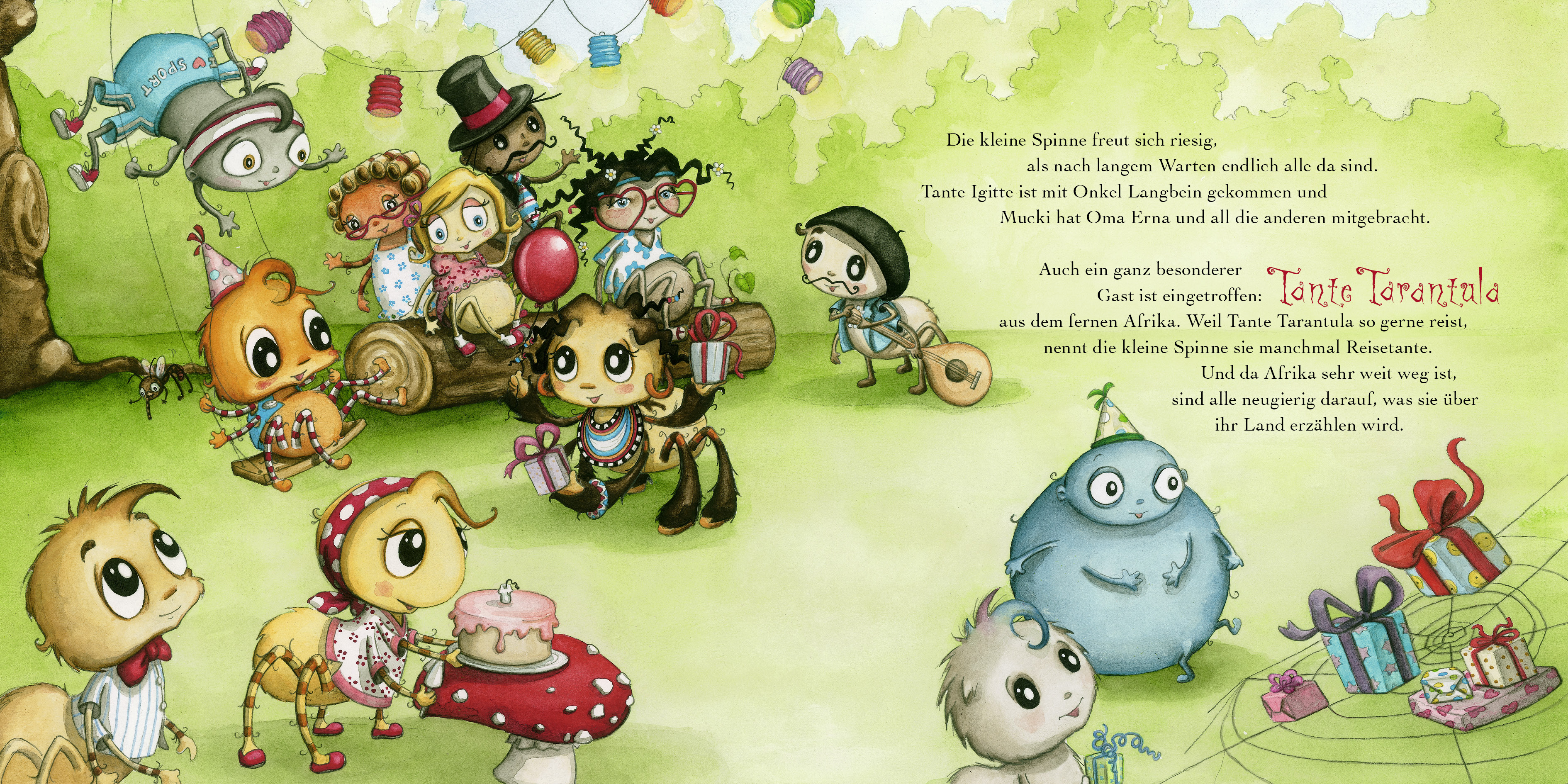 Die kleine Spinne ist ganz aufgeregt, denn sie feiert Geburtstag. Sie hat ihr Netz mit Blümchen geschmückt, und alle sind gekommen: Onkel Langbein, Tante Igitte und all ihre Freunde. Sogar Tante Tarantula aus dem fernen Afrika ist angereist. Die Tante erzählt von spannenden Ausflügen, die sie "Safari" nennt, und sorgt für so manche Überraschung auf Klein-Widerlichs Party.