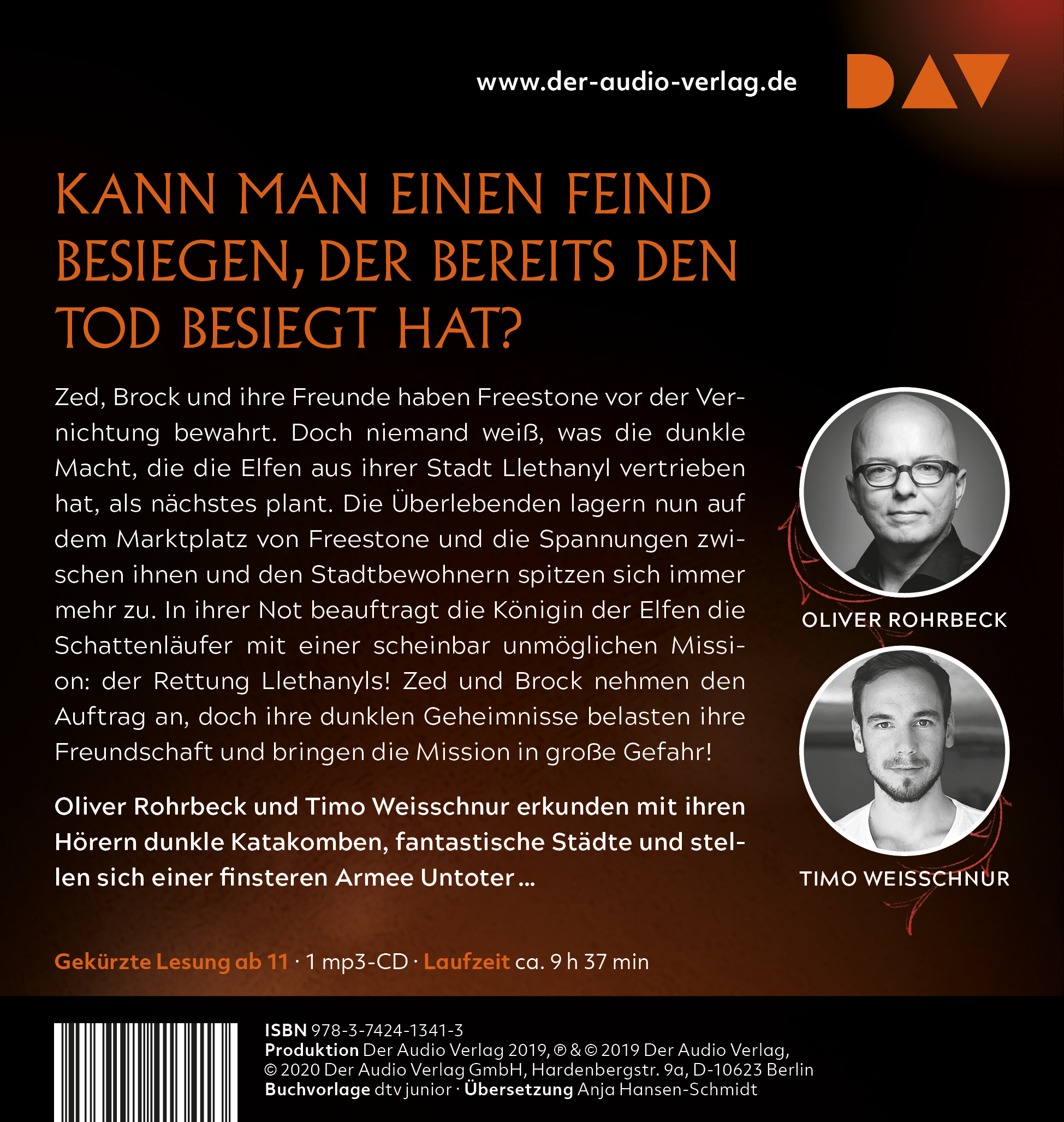 Oliver Rohrbeck, geboren 1965 in Berlin, ist Hörbuchsprecher und Regisseur. Er wurde bekannt als Stimme von Justus Jonas in der Kultserie »Die drei ???«, als Julian bei den »Fünf Freunden« und als die deutsche Stimme von Ben Stiller. Für DAV las er u.a. »Der Blackthorn-Code« von Kevin Sands.