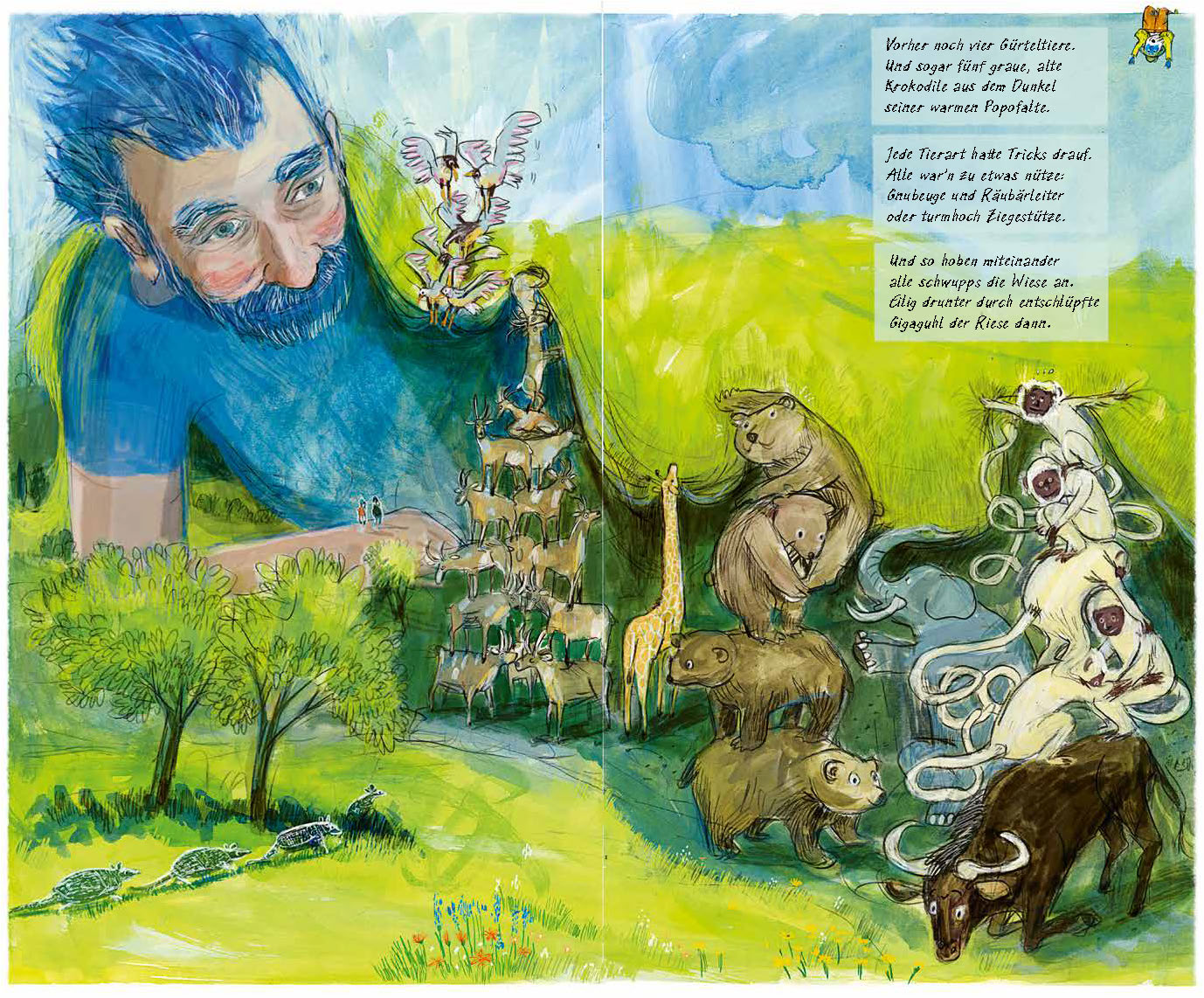 Doch trotz seiner Größe ist er überaus freundlich. Besonders Tiere liebt er sehr. Und so lädt er alle zu sich ein: Unter seinen Armen schläft Familie Fledermaus, in den Hügeln seines Nackens verstecken sich Ziegen und tief in seinem Haar wohnt sogar ein seltenes Einhorn. Als Gigaguhl eines Abends sehr müde wird, deckt er sich mit der bunten Sommerwiese zu und hält viele hundert Jahre Frühlings-, Sommer-, Winterschlaf. In der Zwischenzeit wächst auf den Weiten seines Rückens eine Stadt: Deren Bewohner ahnen natürlich nicht, wer da unter ihnen schlummert. Bis die zwei neugierigen Kinder Nick und Nina auf Entdeckungsreise gehen und ein Riesen-Abenteuer erleben.