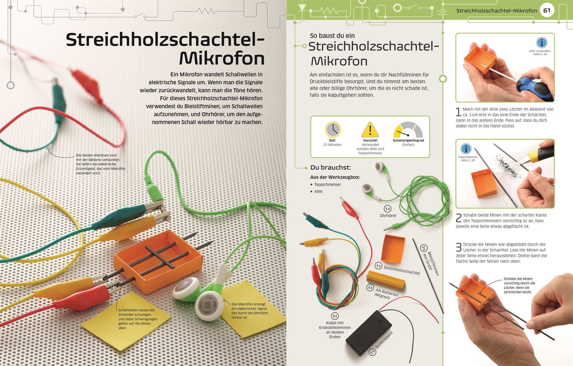 In 18 sensationellen Elektronik-Projekten entstehen coole Lautsprecher für das Smartphone, ein Hand-Ventilator oder eine witzige Türklingel. Mit anschaulichen Schritt-für-Schritt Anleitungen für einfache und kostengünstige Bauteile werden Kinder ab 10 Jahren zu cleveren Erfindern und das Kinderzimmer zur Tüftler-Werkstatt. Dazu gibt es spannendes elektrotechnisches Grundwissen über Werkzeuge, Bauteile, Löten oder Schaltkreise.