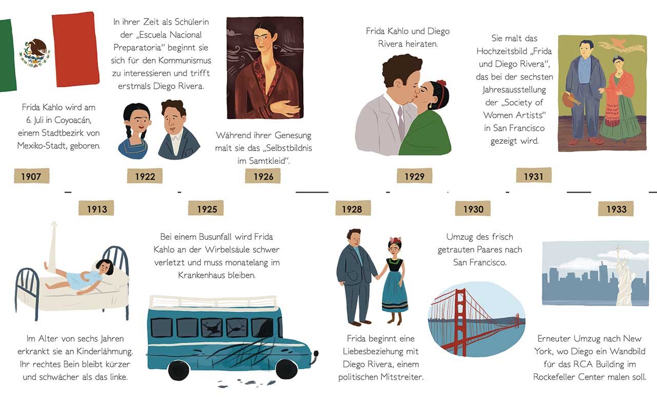 Frida Kahlo war eine Frau, die auffiel. Eigentlich wollte die Mexikanerin Ärztin werden, doch es kam ganz anders. Diese bunte Biografie erzählt Kindern, wie sie zu Malerei fand, über ihr Leben und Leiden im Blauen Haus, über Politik und ihre Erfolge. Mit ihren Bildern und Selbstporträts schuf Frida Kahlo völlig Neuartiges und hat heute einen herausragenden Platz in der Kunstgeschichte.