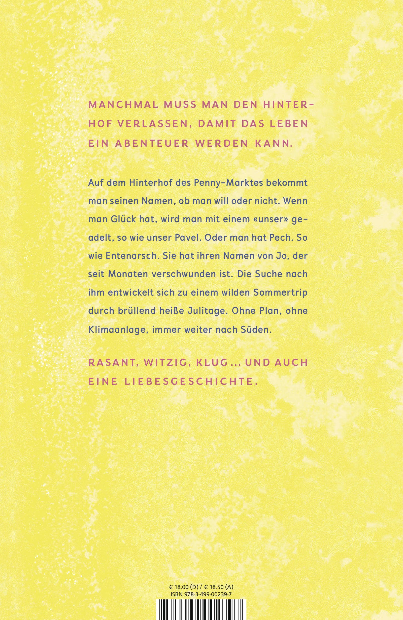 Auf dem Hinterhof des Penny-Marktes bekommt man seinen Namen, ob man will oder nicht. Wenn man Glück hat, wird man mit einem «unser» geadelt, so wie unser Pavel. Oder man hat Pech. So wie Entenarsch. Sie hat ihren Namen von Jo, der seit Monaten verschwunden ist. Die Suche nach ihm entwickelt sich zu einem wilden Sommertrip durch brüllend heiße Julitage. Ohne Plan, ohne Klimaanlage, immer weiter nach Süden.