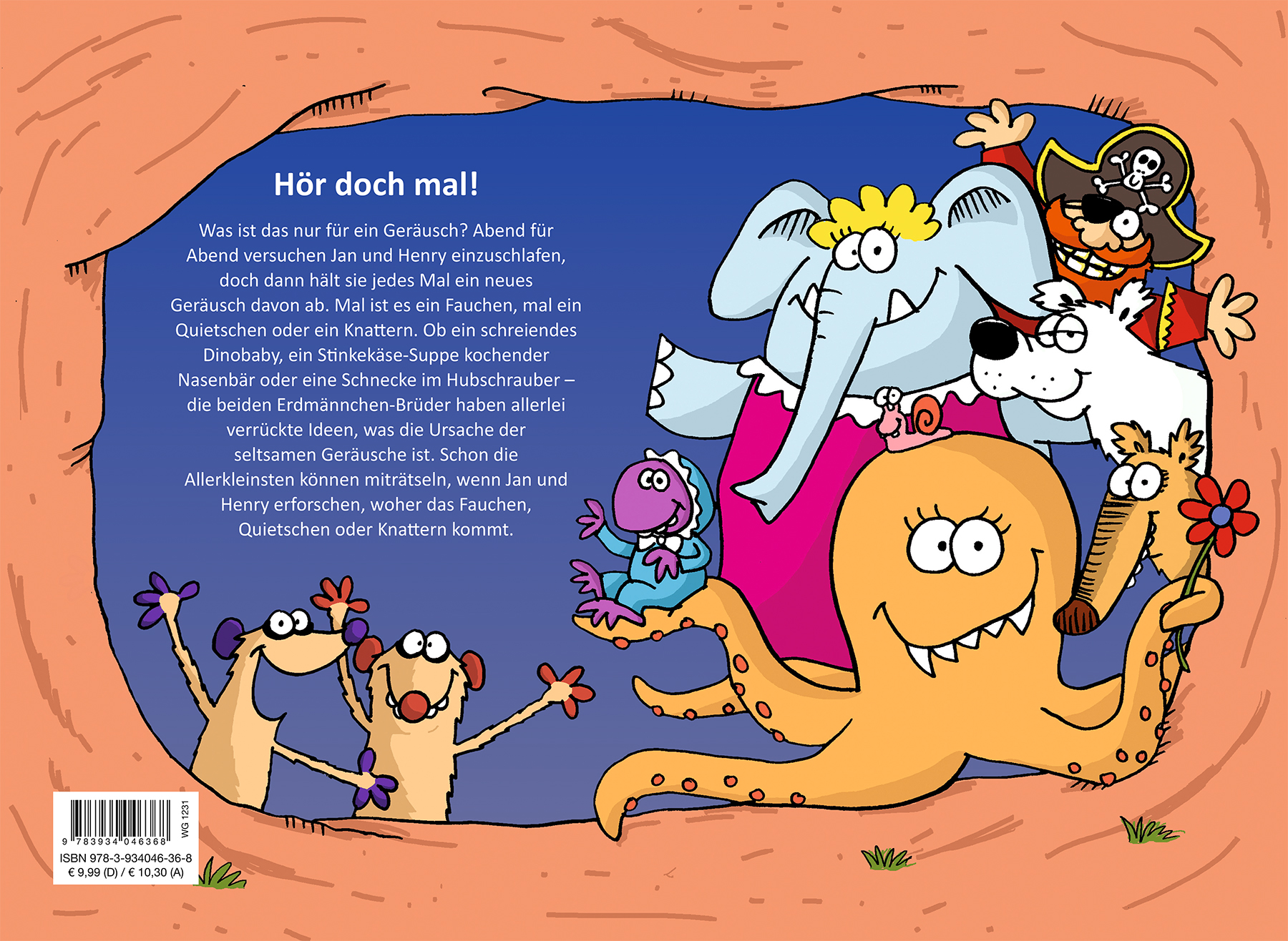 Hör doch mal! Was ist das nur für ein Geräusch? Abend für Abend versuchen Jan und Henry einzuschlafen, doch dann hält sie jedes Mal ein neues Geräusch davon ab. Mal ist es ein Fauchen, mal ein Quietschen oder ein Knattern. Ob ein schreiendes Dinobaby, ein Stinkekäse-Suppe kochender Nasenbär oder eine Schnecke im Hubschrauber - die beiden Erdmännchen-Brüder haben allerlei verrückte Ideen, was die Ursache der seltsamen Geräusche ist. Schon die Allerkleinsten können miträtseln, wenn Jan und Henry erforschen, woher das Fauchen, Quietschen oder Knattern kommt.