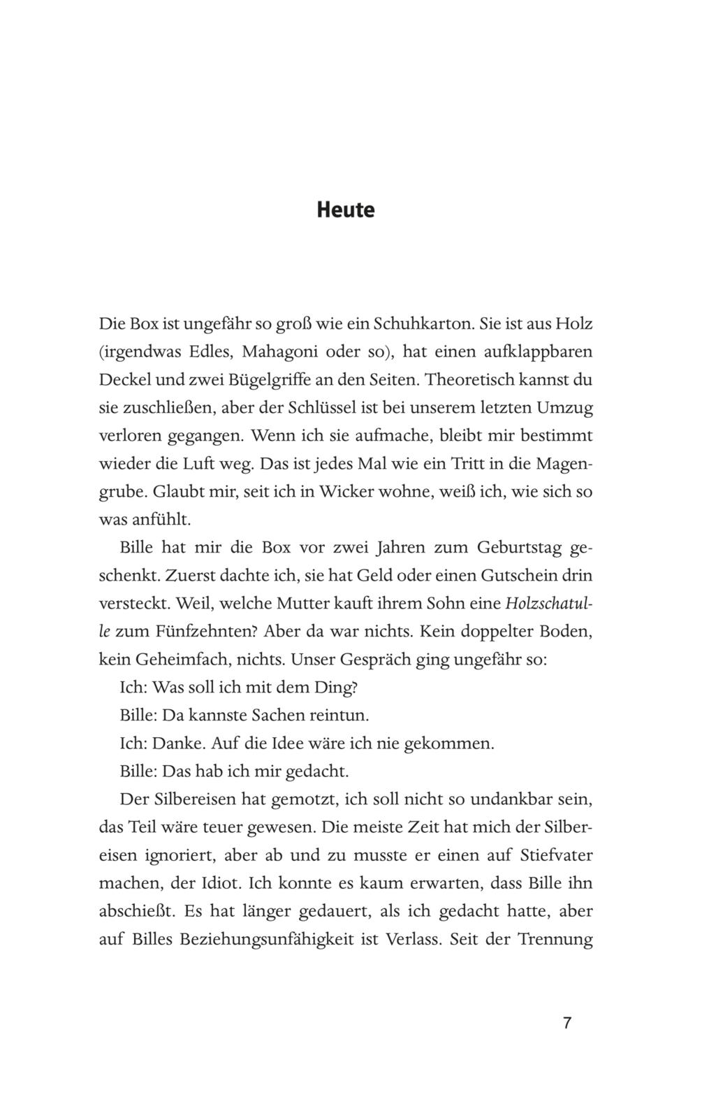 Der Umzug muss sein, sagt Pauls Mutter. Aber Paul will nicht. Nicht packen. Nicht raus aus Opas alter Villa. Und vor allem nicht in die Box schauen, diese Schatulle voller Erinnerungen. Denn was er dort versteckt hat – die Superhelden-Story, die blöden Kondome, das Messer und mehr –, bringt nur das letzte Jahr zurück. Das harte Jahr, in dem so viel passiert ist. Ken, Mehmet, Mara. Die durchgeknallten Aktionen, das Mobbing und … das völlig Unfassbare. Aber Wegsehen hilft nicht. Paul muss sich der Erinnerung stellen, Stück für Stück.