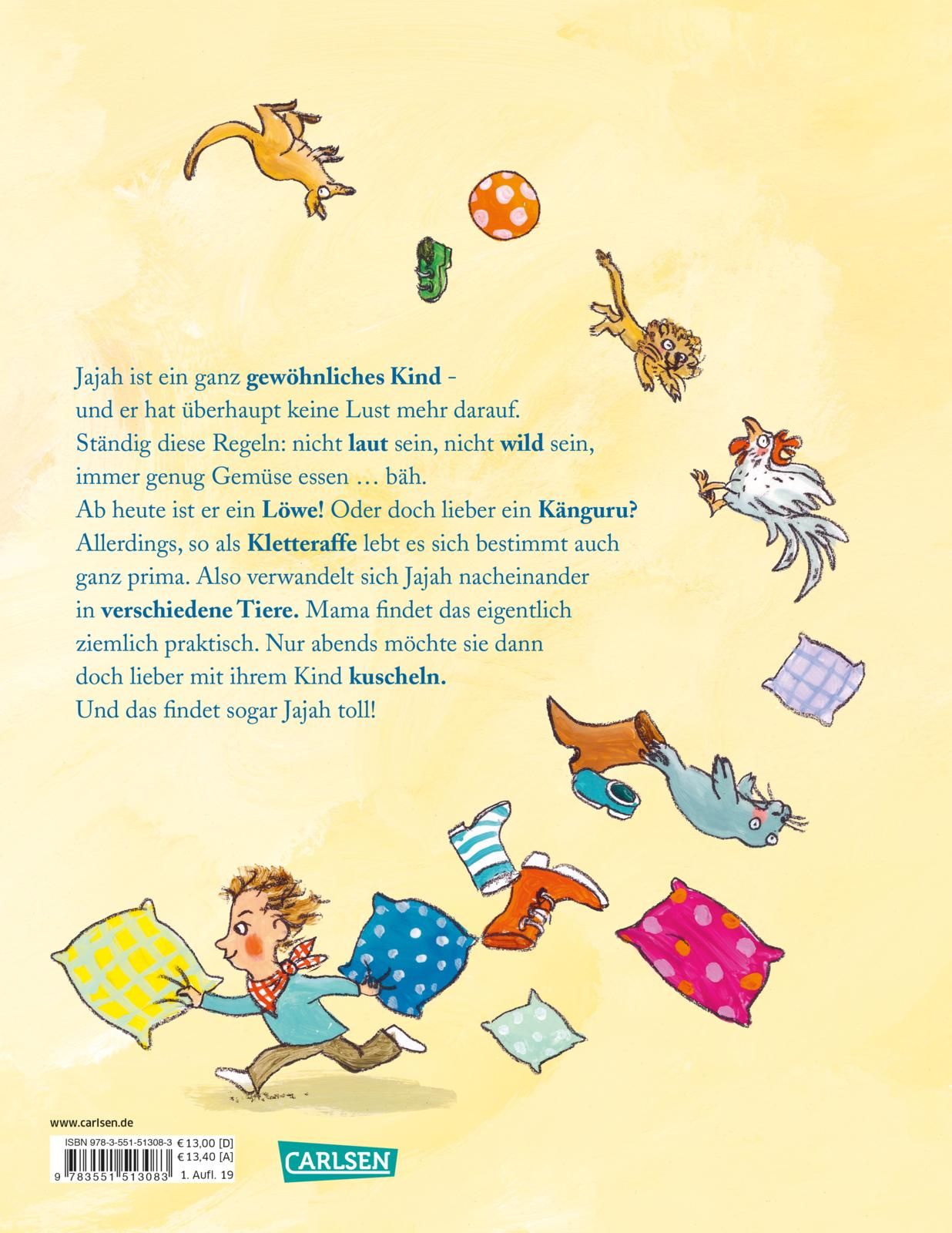 Jajah ist ein ganz normales Kind - und er hat echt überhaupt keine Lust mehr darauf. Ständig diese doofen Regeln: nicht laut sein, nicht wild sein, immer genug Gemüse essen … Bäh! Ab heute ist er ein Löwe. Oder doch lieber ein Känguru? Zum Glück fallen Jajah jede Menge tolle Tiere ein, in die er sich verwandeln kann.
