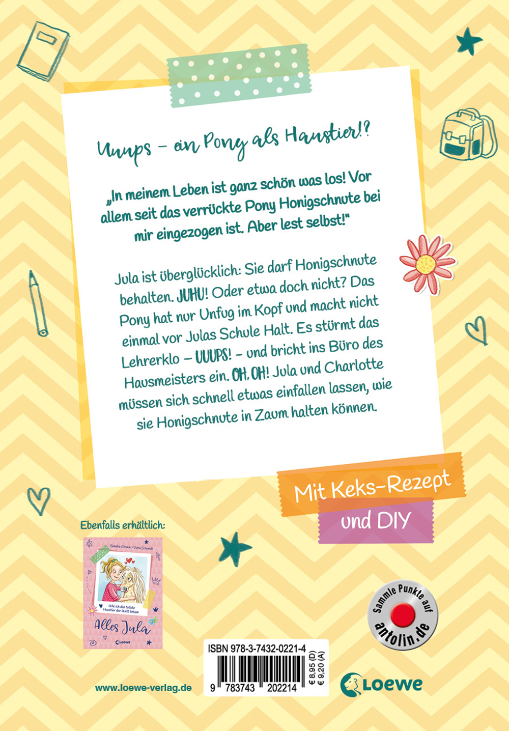 Jula ist überglücklich, denn sie darf Honigschnute behalten. Juhu! Oder etwa doch nicht? Das Pony hat nur Unfug im Kopf und macht nicht einmal vor Julas Schule Halt. Es stürmt das Lehrerklo - uuups! Und bricht ins Hausmeisterbüro ein. Oh, oh! Das gibt Ärger! Jula und Charlotte müssen sich schnell etwas einfallen lassen, wie sie Honigschnute in Zaum halten können.