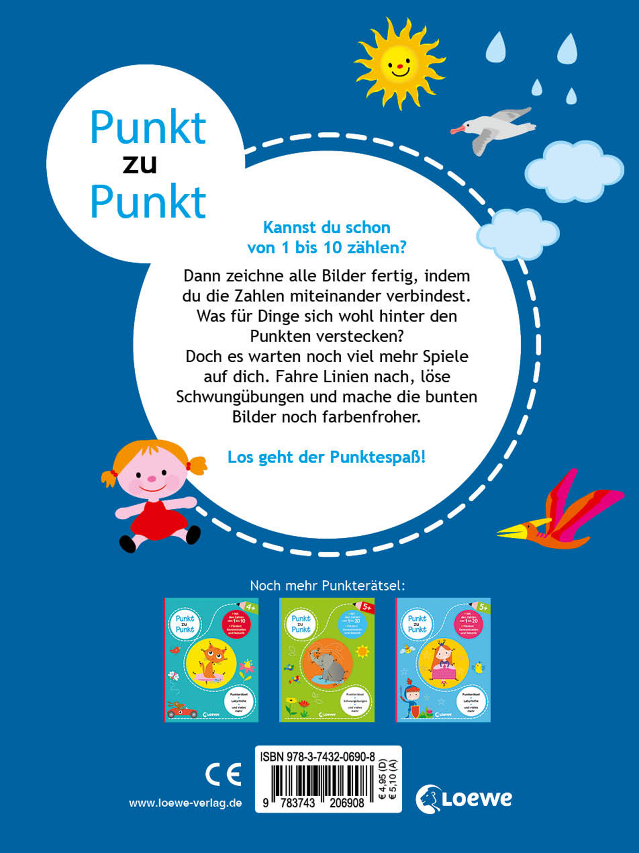 Angefangen beim einfachen Nachspuren heißt es für Kinder ab 4 Jahren schließlich Punkte und zuletzt Zahlen verbinden. Das Zählen lernen sie so ganz nebenbei – und ihrer Kreativität können sie beim Ausmalen der Bilder freien Lauf lassen.