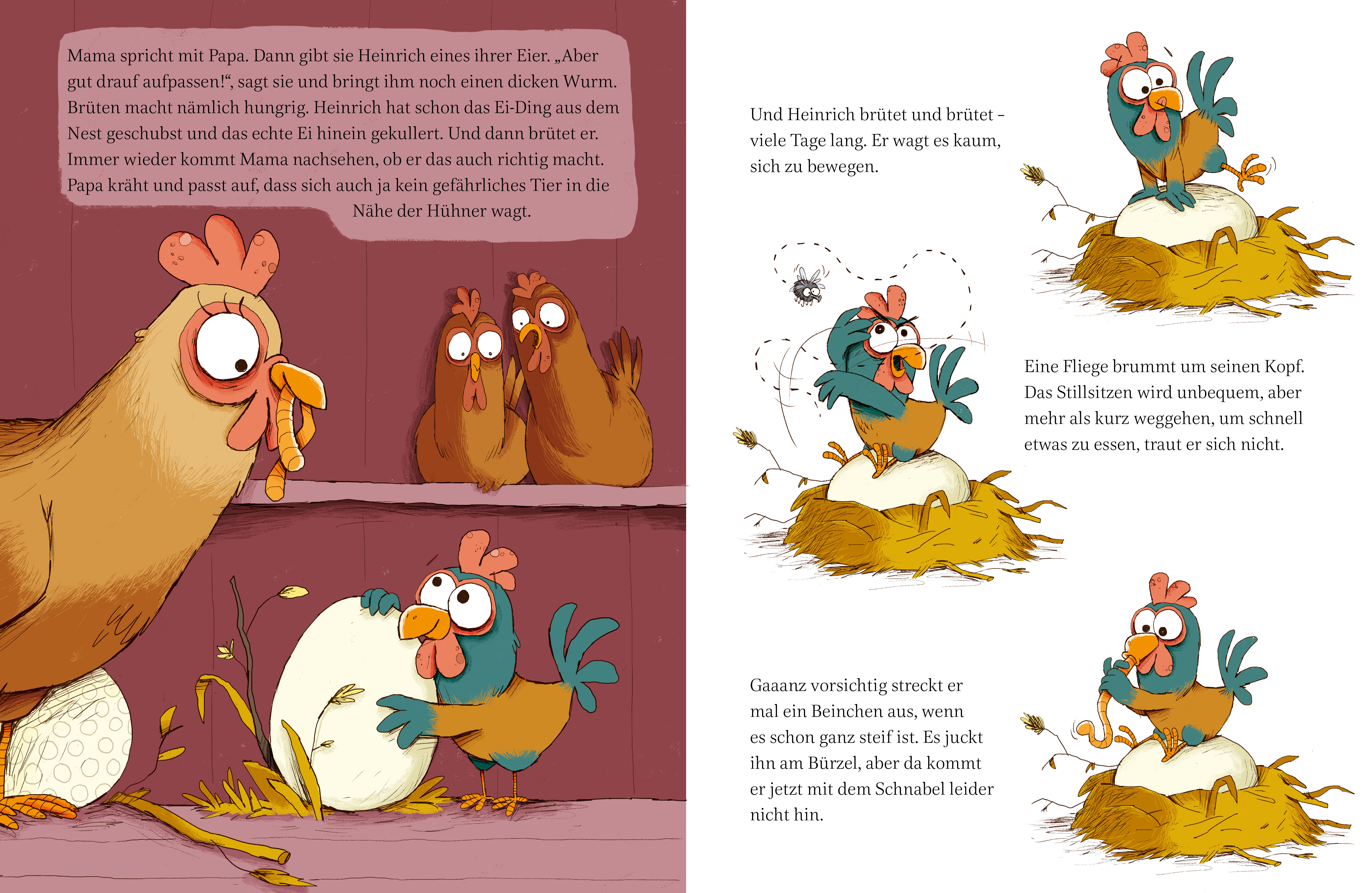 Was?! Brüten ist nur Hennensache? Das wär' doch wohl gegackert und gelacht! Also, schnappt Heinrich sich ein Ei und legt los ...