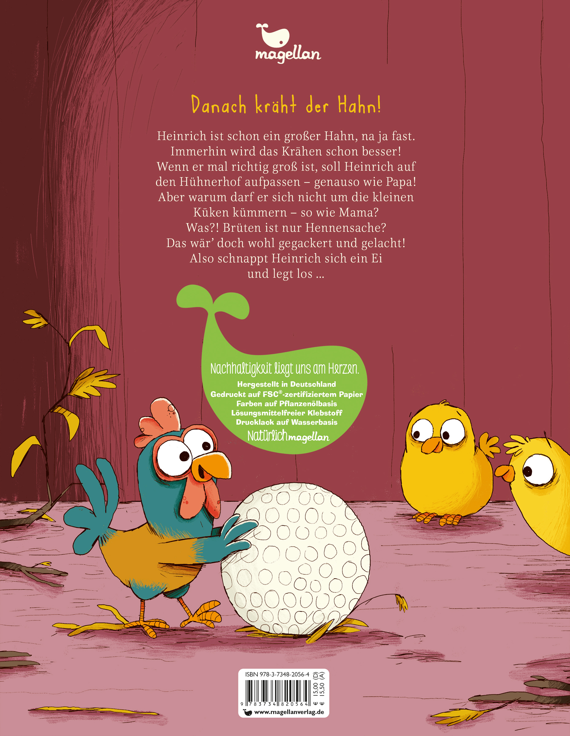 Heinrich ist schon ein großer Hahn, na ja fast. Immerhin wird das Krähen schon besser! Wenn er mal richtig groß ist, soll Heinrich auf den Hühnerhof aufpassen - genauso wie Papa! Aber warum darf er sich nicht um die kleinen Küken kümmern - so wie Mama?