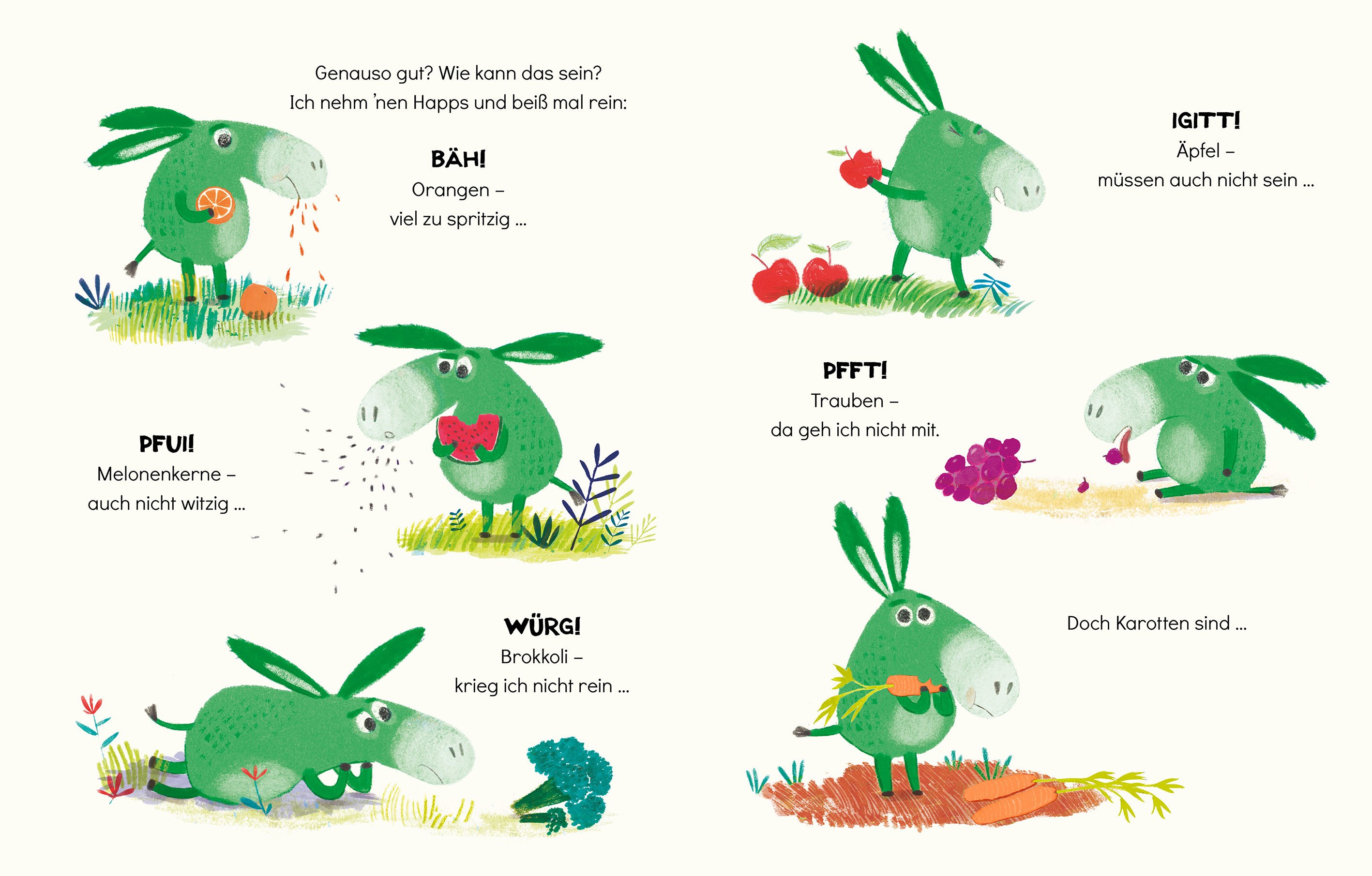 Äpfel? Igitt! Brokkoli? Nichts da! Der kleine Esel liebt Gras - und das isst er am allerliebsten morgens, mittags und abends. Mal was Neues versuchen? Nö. Da kann Mama noch so lange erzählen, dass es auf der Welt auch andere leckere Sachen gibt. Doch was ist das? Plötzlich ist der kleine Esel GRÜN! Grasgrün! Ob es am Ende wohl doch nicht so verkehrt ist, auf Mama zu hören?