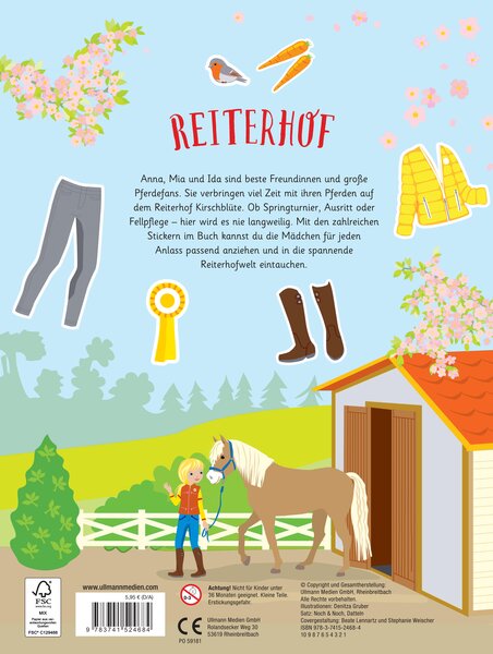 Anna, Mia und Ida sind beste Freundinnen und große Pferdefans. Sie verbringen viel Zeit mit ihren Pferden auf dem Reiterhof Kirschblüte. Ob Springturnier, Ausritt oder Fellpflege - hier wird es nie langweilig. Mit den zahlreichen Stickern im Buch kannst du die Freundinnen einkleiden und in die spannende Reiterhofwelt eintauchen.
