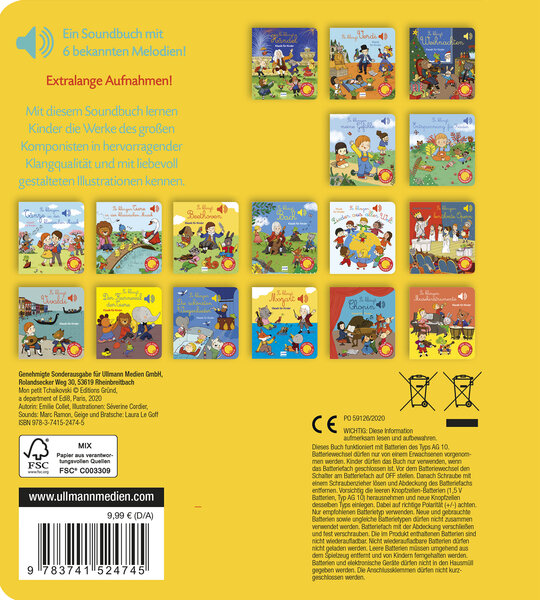 Dieses Soundbuch für kleine Musikfans ab 2 Jahren bietet extralange Aufnahmen in hervorragender Klangqualität. Sechs bekannte Melodien, erklärende Texte und fröhlich-bunte Illustrationen zu jedem Stück bieten einen idealen Einstieg in die Welt der klassischen Musik. Mit integriertem Soundchip auf jeder Doppelseite, On-/Off-Schalter sowie Abspiel-Stopp-Funktion.