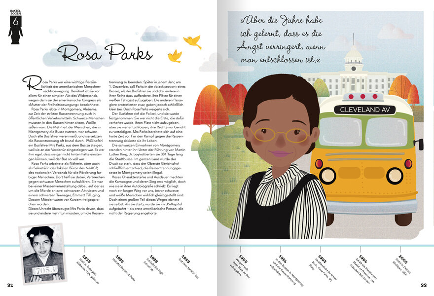 Großartige Frauen der Weltgeschichte ist eine illustrierte Zusammenstellung von Frauen, die sich weigerten, "normal" zu sein. Vorgestellt werden 40 Frauen aus Politik, Wissenschaft, Sport, Kunst und Unterhaltung. Sie alle wagten es, zu träumen und gaben niemals auf, selbst wenn es ihnen nahegelegt wurde. Dieses Buch feiert die großartigen Erfolge, die sie erzielten und uns als Vermächtnis hinterließen. Entdecke ihre inspirierenden Geschichten - und bastle zehn der berühmten Frauen als kleine "Taschen-Vorbilder", die du mit dir herumtragen oder auf deinen Schreibtisch stellen kannst.
