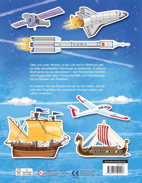 Über und unter Wasser, in der Luft und im Weltraum gibt es viele verschiedene Fahrzeuge zu entdecken. In diesem Buch lernst du sie alle kennen - von historischen Schiffen und Fluggeräten über Transportschiffe und Hubschrauber bis zu Raketen und Satelliten. Im hinteren Teil des Buches kannst du den Hafen, das All oder den Flughafen mit zahlreichen Stickern selbst zum Leben erwecken.
