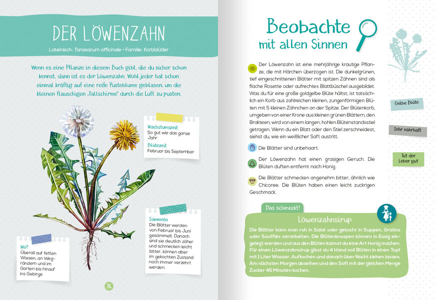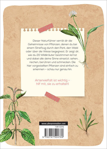 Dieser Naturführer verrät dir die Geheimnisse von Pflanzen, denen du beieinem Streifzug durch den Park, den Wald oder über die Wiese begegnest. Er zeigt dir,wie du 20 Wildkräuter bestimmen lernst und dabei alle deine Sinne einsetzt: sehen, riechen, berühren und schmecken. Die hier vorgestellten Pflanzen sind einfach zu erkennen - schau nur genau hin. Welcher Käfer ist das auf dem Blatt? Welcher Vogel ruft da im Gebüsch? Kann man diese Pflanze essen? Wer sich für die Natur interessiert, hat viele Fragen. Die neue Reihe "Mein Naturführer" bietet einen ersten Einstieg für alle, die sich dem Buch der Natur mit offenen Augen und Ohren nähern wollen. Einführung und Bestimmungsbuch zugleich, stellt jeder Band eine Auswahl der maßgeblichsten Tier- und Pflanzenarten vor, hilft, sie zuverlässig bestimmen zu können, zu verstehen, was sie zum Leben brauchen und was wir alle dafür tun können, um sie zu schützen und ihren Lebensraum zu bewahren. Die ideale Reihe für aufgeweckte Kids, die mehr über die Natur wissen wollen, die uns umgibt.