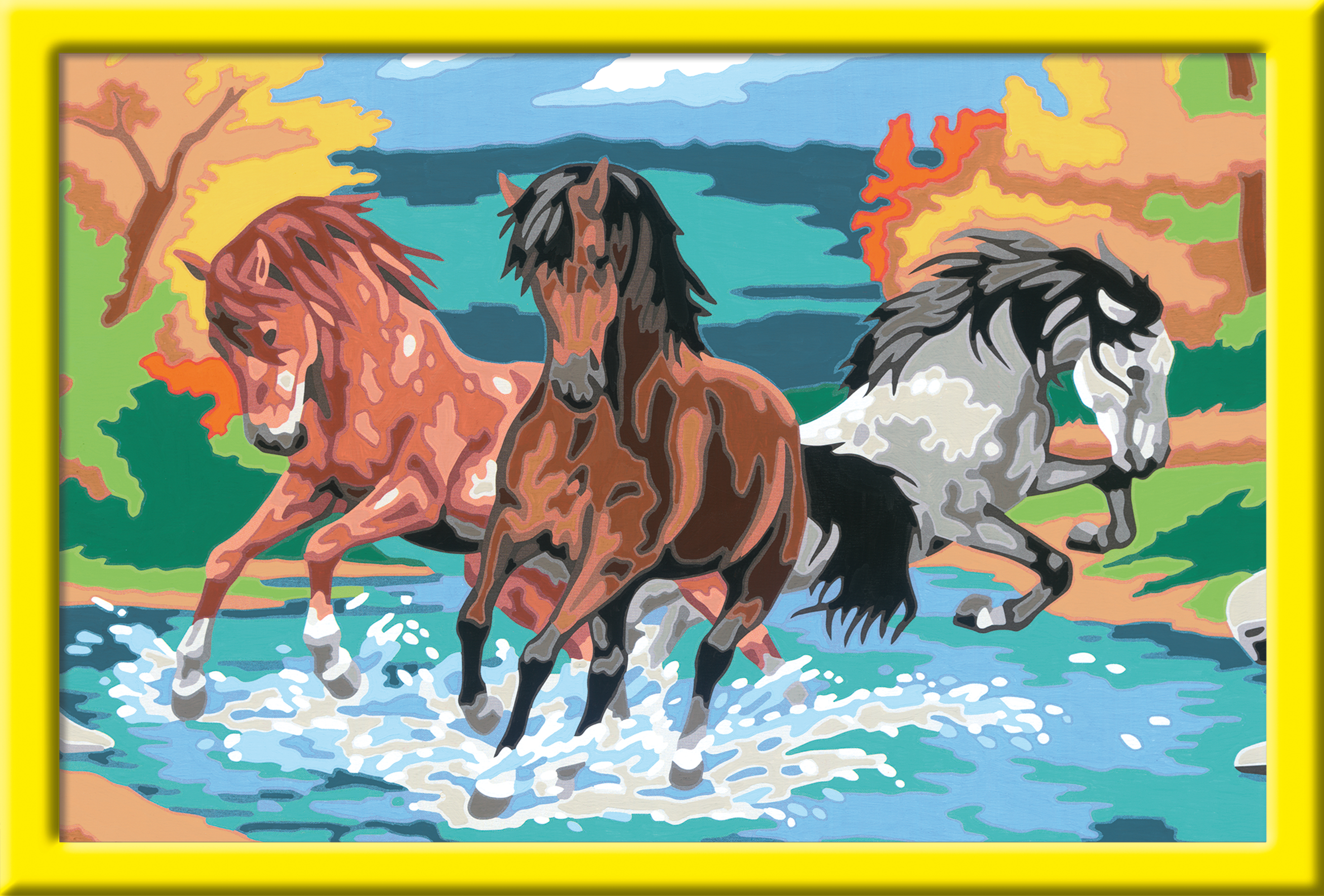 Dank der farbigen Motivlinien, können die Kinder das ganze Motiv Stolze Wildpferde und die Farben schneller erkennen. Der Pinsel hat eine gute Führung und so entsteht ein perfektes Bild.