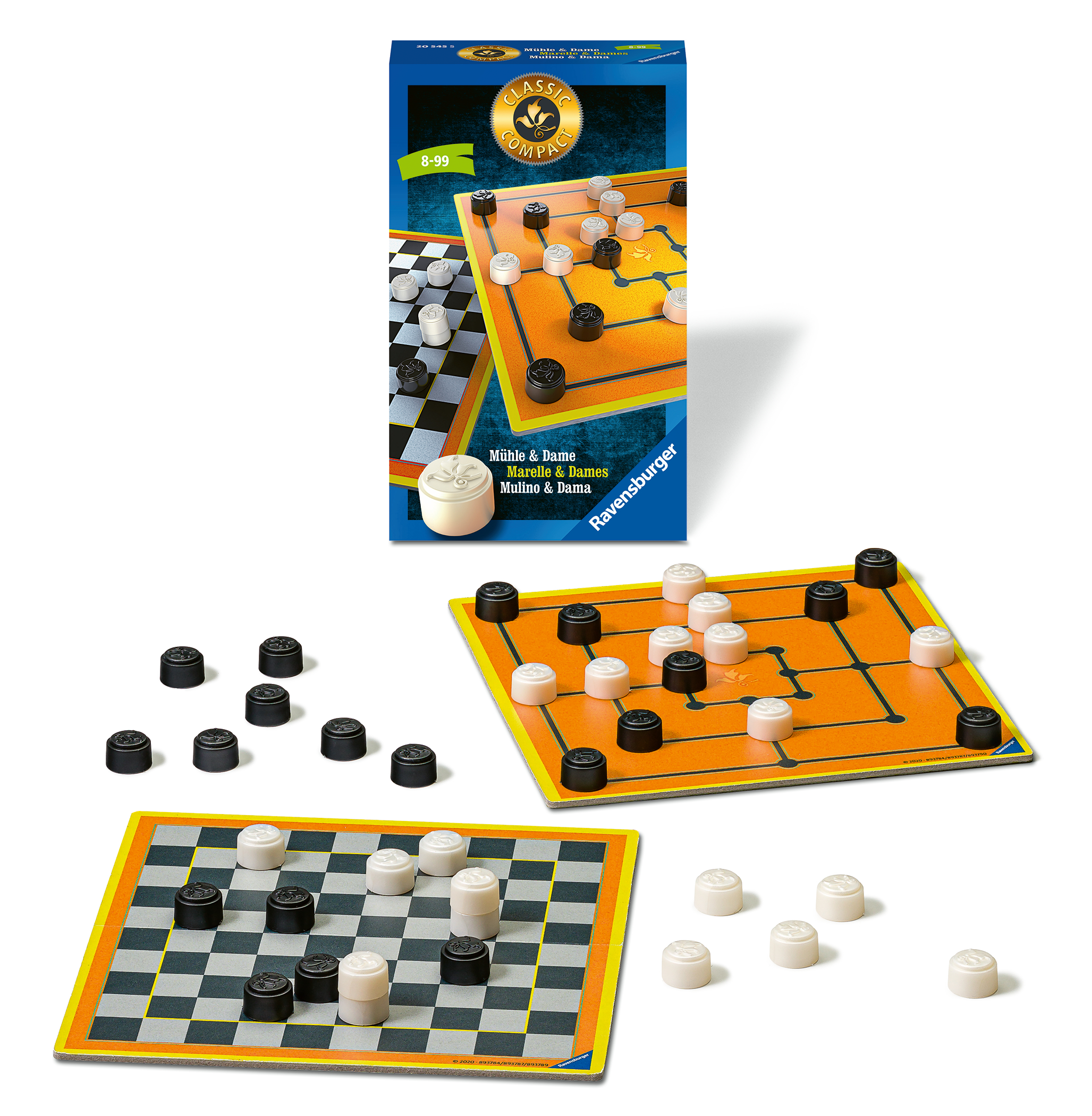 Ravensburger 20545 - Classic Compact: Mühle & Dame, Mitbringspiel für 2 Spieler, ab 8 Jahren, kompaktes Format, Reisespiel, Klassiker