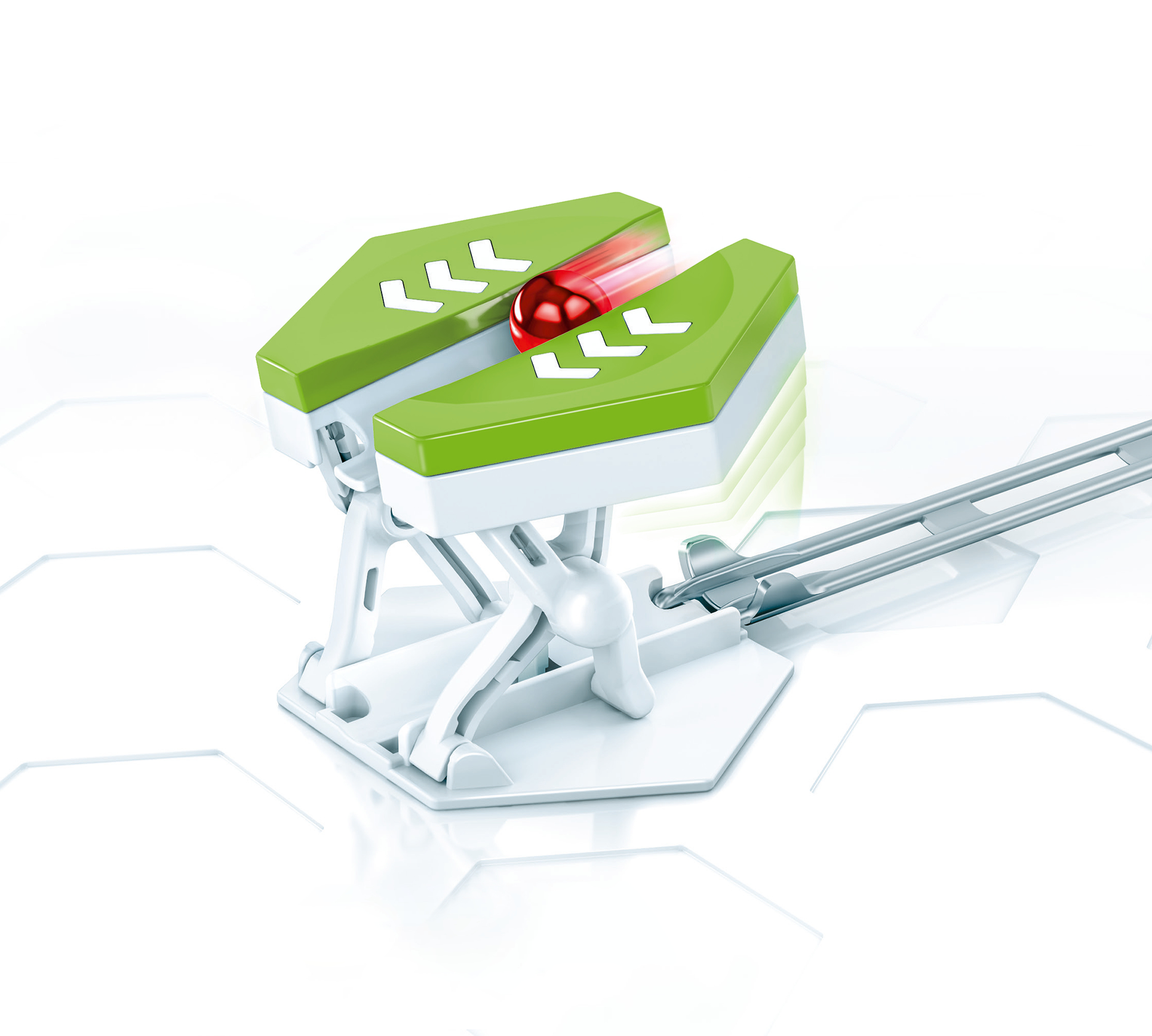 Der Jumper hebt die Kugel auf eine höhere Ebene und erzeugt dabei gleichzeitig einen Durchfahrtstunnel. Kombiniert mit einem GraviTrax Starter-Set bringt dies noch mehr Action in die spannende Welt der Kugelbahn. Wie lassen sich die Wege der Kugeln mit dem Jumper aufteilen?