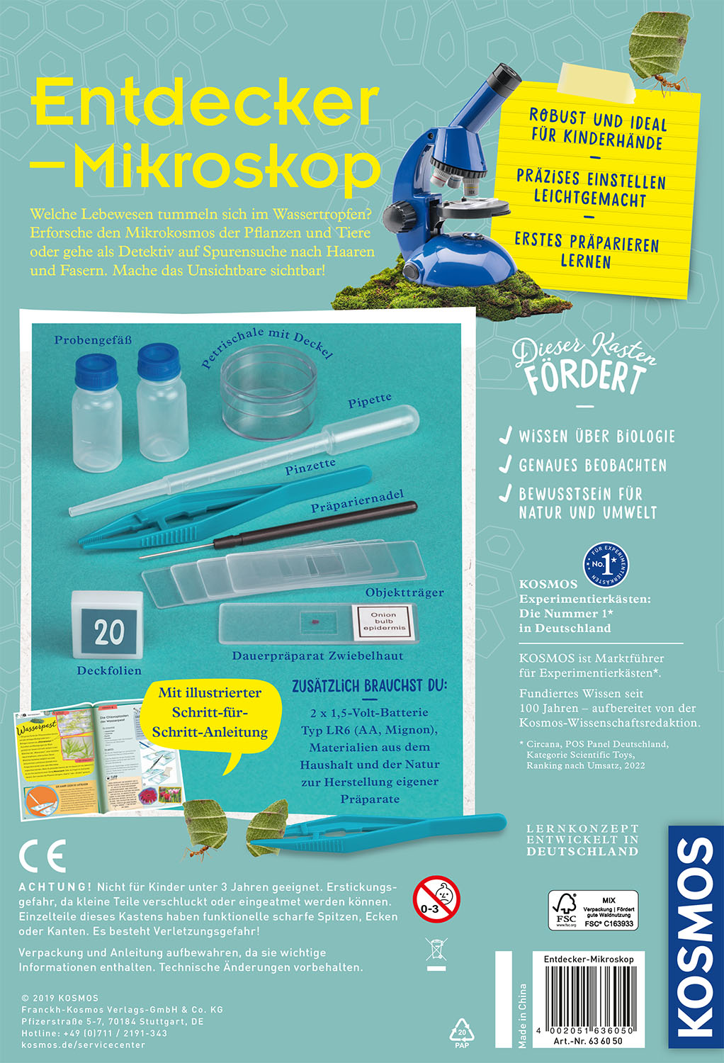 Das Unsichtbare sichtbar machen! Kinderleicht den Mikrokosmos der Pflanzen und Tiere untersuchen oder als Detektiv auf Spurensuche nach Haaren und Fasern gehen. Welche Lebewesen tummeln sich im Wassertropfen? Mit dem robusten und einfach zu handhabenden Mikroskop werden kleinste Dinge bei einer bis zu 600fachen Vergrößerung untersuchen. Die hohe Qualität ermöglicht ein präzises Einstellen. Mit dem Komplettset inkl. Präparierzubehör wird das Herstellen einfacher Untersuchungsobjekte und Präparate erlernt. Ein perfekter Start als Natur-Detektiv! Das Begleitheft enthält eine übersichtliche Anleitung zur Benutzung des Mikroskops und ermöglicht mit spannendem Hintergrundwissen einen einfachen, wissenschaftlichen Einstieg in die Mikroskopie. Dieses KOSMOS Experimentier-Set eignet sich für Einsteiger und neugierige Kinder von 8 bis 11 Jahren, fördert genaues Beobachten, vermittelt Wissen über Biologie und schärft das Bewusstsein für Natur und Umwelt. Nicht zu glauben, was sich in Wassertropfen, Staub, Blütenpollen oder sogar Haaren verbirgt! Mit dem Experimentierkasten Entdecker-Mikroskop von KOSMOS erforschen Kinder ab 8 Jahren eine faszinierende Welt im Miniformat. Dank der qualitativ hochwertigen Objektive, Okulare und Linsen ist eine bis zu 600fache Vergrößerung der Präparate möglich. Die bebilderte Anleitung beschreibt genau, wie das Einsteiger-Mikroskop richtig eingestellt, einfache Versuchsobjekte vorbereitet und unter Durchlicht untersucht werden. Angehende Forscher und Detektive dürfen sich auf zauberhafte Muster, Zellen und Kleinstlebewesen freuen, die sie mit bloßem Auge in Natur und Haushalt niemals entdecken würden. Ein Mikroskop für Kinder und Anfänger.