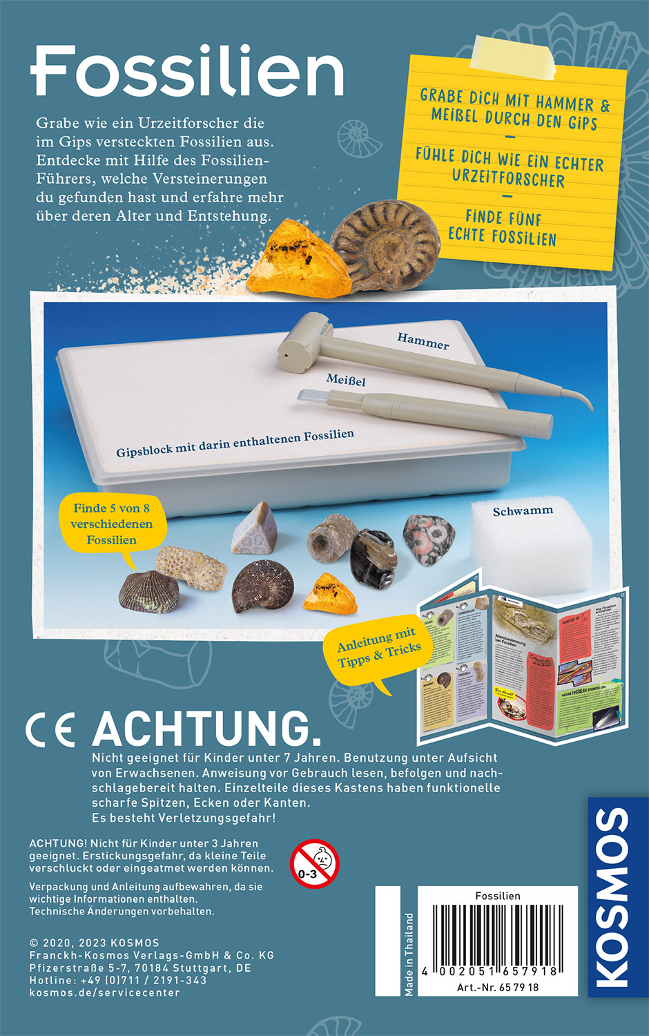 Graben, entdecken, staunen - einfach unglaublich, dass sich echte Fossilien, wie Haizahn, Steinkoralle, Atrypa-Schale, Schnecken und ein Bernstein in diesem Gips-Ausgrabungsblock verstecken. Das Experimentierset enthält als Werkzeug Hammer, Meißel und Schwämmchen - einfach den Gips anfeuchten und schon kann die Reise in längst vergangene Zeiten starten. Die farbige Anleitung erklärt die beste Technik beim Ausgraben und verrät Wissenswertes über Fossilien, Versteinerungen und die Arbeiten eines Urzeit-Forschers. Ein spannendes KOSMOS Ausgrabungsset für neugierige Kinder ab 7 Jahren. Graben, entdecken, staunen - mit diesem Set geht's auf eine spannende Zeitreise! Einfach unglaublich, dass sich echte Fossilien, wie Haizahn, Steinkoralle, Atrypa-Schale, Schnecken und Bernstein in diesem Gips-Ausgrabungsblock verstecken. Mit Hammer und Meißel graben sich kleine Urzeit-Forscher behutsam durch die unterschiedlichen Gipsschichten. Das geht ganz einfach mit der Anleitung: Sie erklärt den Kindern, wie sie bei ihren Erkundungen am besten vorgehen und beantwortet viele Fragen, die beim Spielen rund um das Thema Fossilien entstehen. Die tollen Fossilien-Funde sollen natürlich auch Freunde, Geschwister und Eltern bewundern! Im Handumdrehen sind schöne Präsentationsschachteln gebastelt, die das Kinderzimmer in ein kleines Museum verwandeln.