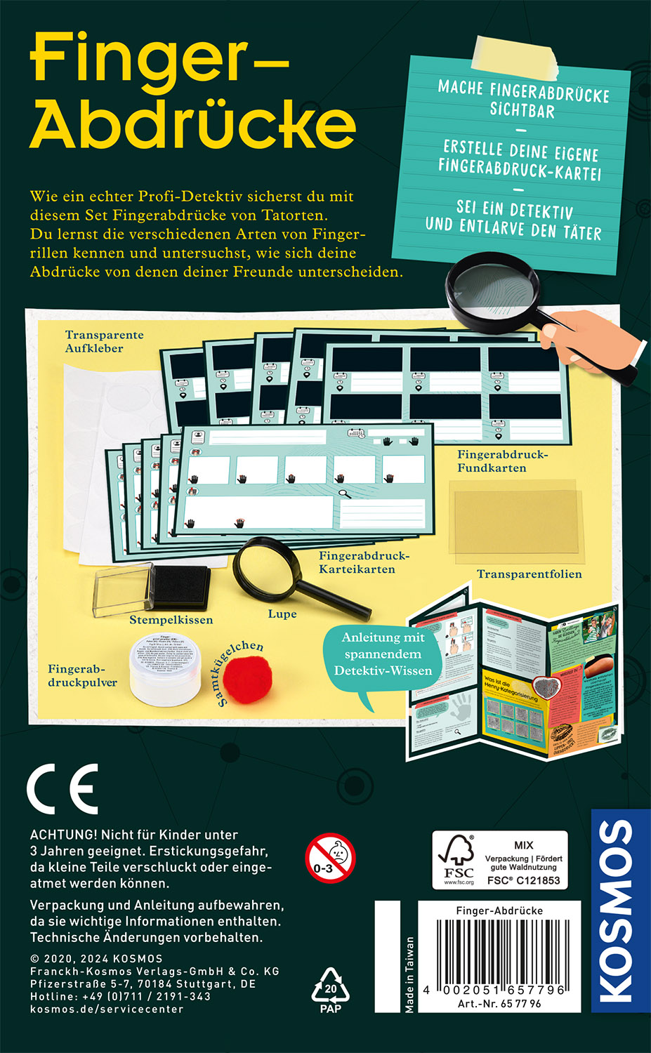 Hier kommen pfiffige Detektiv-Kids dem Täter auf die Spur! Ausgestattet mit Fingerabdruckpulver, Lupe, Stempelkissen und durchsichtigen Aufklebern werden Beweise gesichert und auf Karteikarten aufbewahrt. Hinweise sammeln, archivieren und vergleichen, mit diesem Detektiv-Set überführen Kinder wie im Krimi die Übeltäter im Handumdrehen. Die farbige Anleitung zeigt die unterschiedlichen Methoden, um Fingerabdrücke am Tatort zu sichern und erklärt, was das Besondere an unseren Hautrillen ist. Ob als Geschenk oder als Teil einer coolen Kindergeburtstags-Party, das Experimentierset "Fingerabdrücke" bietet kriminologischen Spaß für Kinder ab 8 Jahren. Übeltäter aufgepasst! Warum ist plötzlich die Tür zum Süßigkeitenschrank offen? Wer hat den letzten Keks aus der Dose geklaut? Ab jetzt kommen schlaue Kids dem Rätsel auf die Spur! Ausgestattet mit Fingerabdruckpulver, Lupe, Stempelkissen, durchsichtigen Aufkleber und Co. lösen Kinder mit diesem KOSMOS Experimentierset wie im Krimi ihre ersten Detektivfälle. Sie können mit Karteikarten verdächtige Fingerabdrücke archivieren und durch Vergleichen der Funde am Tatort den Täter überführen. Die Anleitung zeigt die unterschiedlichen Methoden, mit denen Fingerabdrücke abgenommen und verglichen werden, erklärt den kleinen Detektiven, wie durch Hände Beweise entstehen und warum unsere Hautrillen an den Fingern so besonders sind. Ein großer kriminologischer Spaß im Kinderzimmer!
