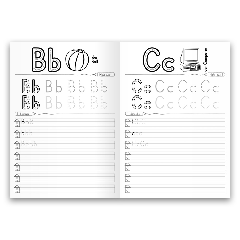 - Das Schreiblernheft zeigt Kindern alle Buchstaben von A-Z mit dazu passenden Motiven und Begriffen.