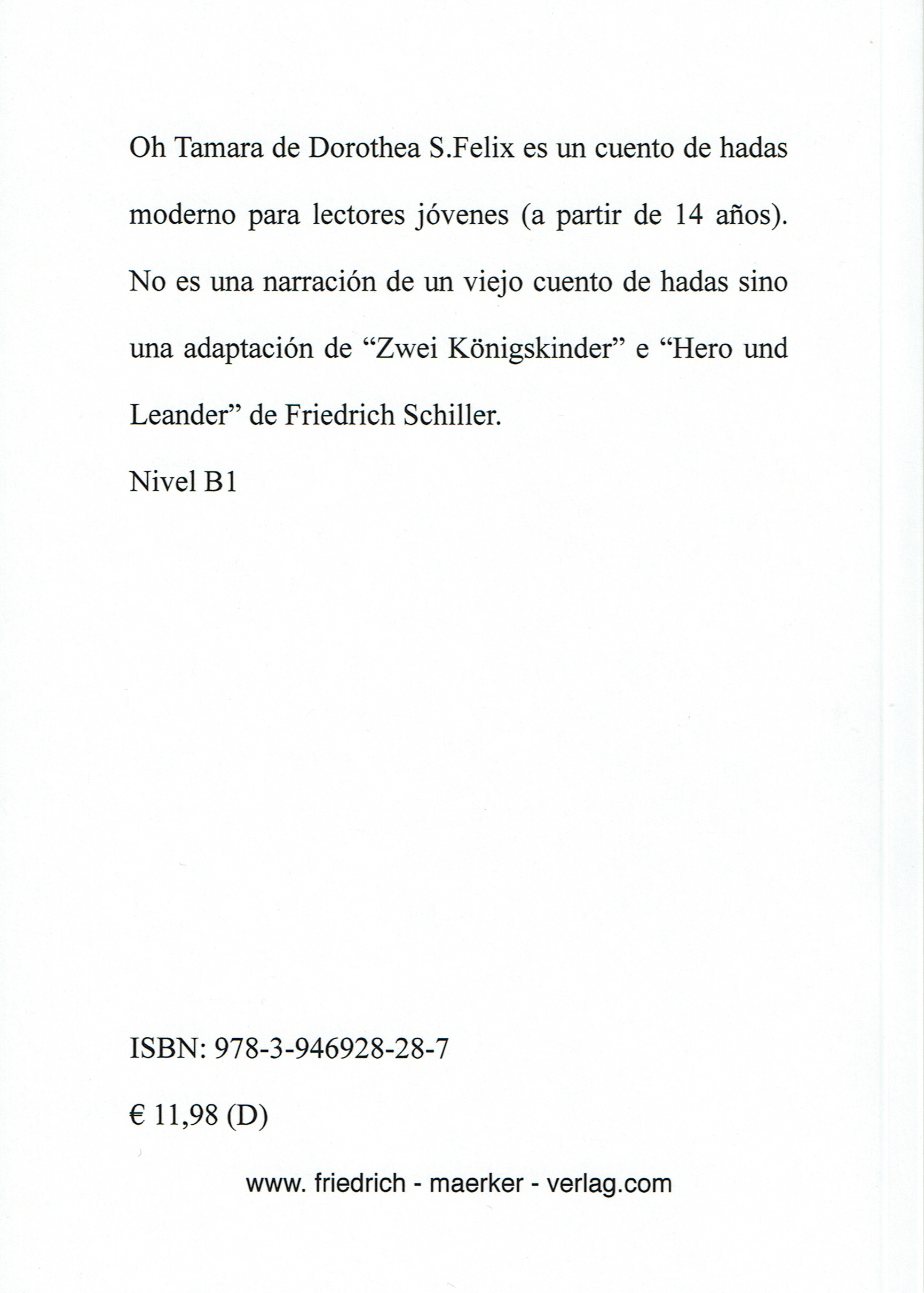 „Ach Tamara“ von Dorothea S. Felix ist ein modernes Märchen für Leser ab 14 Jahren. Es ist kein altes Märchen nacherzählt, sondern wurde in Anlehnung an „Zwei Königskinder“ und „Hero und Leander“ von Friedrich Schiller geschrieben. Hier ist es die Ausgabe in Spanisch, es gibt das Buch aber auch in Deutsch, Englisch und Französisch.
