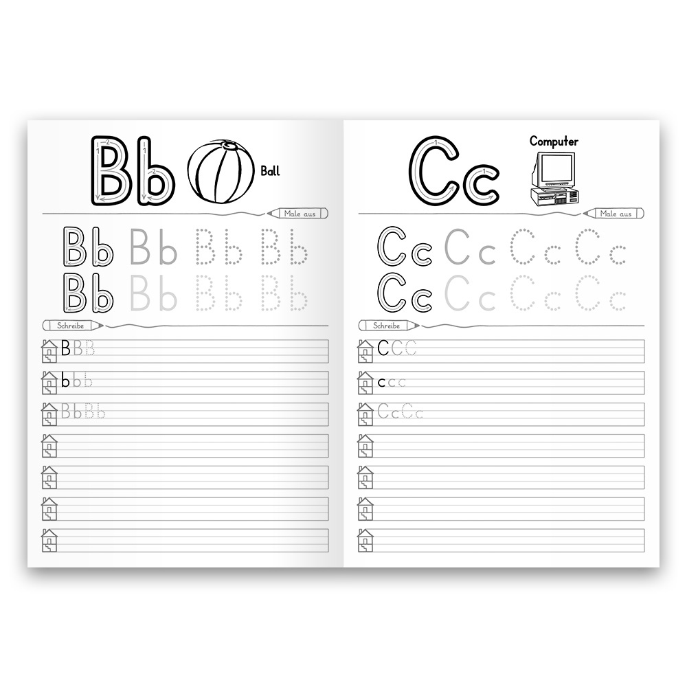 - In dem Schreiblernheft finden Kinder alle Buchstaben von A - Z und die Umlaute Ä, Ö und Ü mit Artikeln.