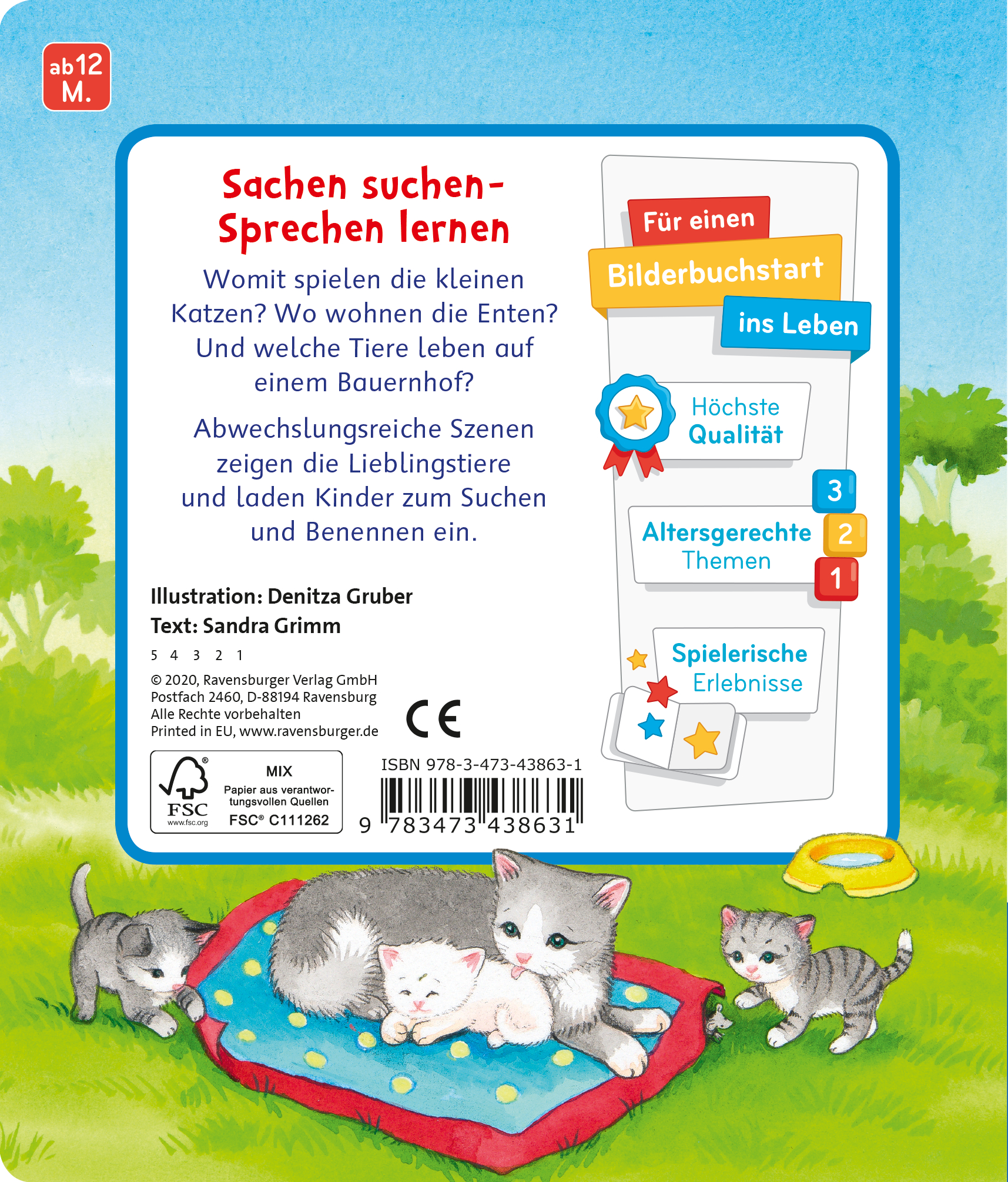 Die Pappbilderbücher aus der Kleinkindreihe "Mein erstes Sachen Suchen" im extra handlichen Format sind der ideale Einstieg in die beliebte "Sachen suchen"-Welt. Auf jeder Doppelseite können die Kleinen ab 12 Monaten Vignetten benennen und in bekannten Situationen im Bild wiedererkennen. So wird der Spracherwerb optimal unterstützt. Die Seiten sind extra dick und damit stabil und langlebig. So können schon kleine Kinderhände diese leicht umblättern, um auf jeder Seite etwas Neues zu entdecken.In diesem Buch dreht sich alles um die kunterbunte Welt der Tiere. Die kleinen Katzen spielen im Garten. Die Enten schwimmen mit ihren Küken auf dem See. Die Hunde toben im Stadtpark. Auf dem Bauernhof leben Kühe und Schafe auf der Weide. Im Zoo sind Elefanten, Zebras, Giraffen und Affen zu sehen. Und in der Abenddämmerung sind Rehe, Wildschweine und Igel am Waldrand unterwegs.Die Suchbilder laden zum genauen Hinsehen ein. Beim gemeinsamen Benennen und Wiederfinden wird der Wortschatz erweitert. Damit fällt das Sprechen lernen leicht!