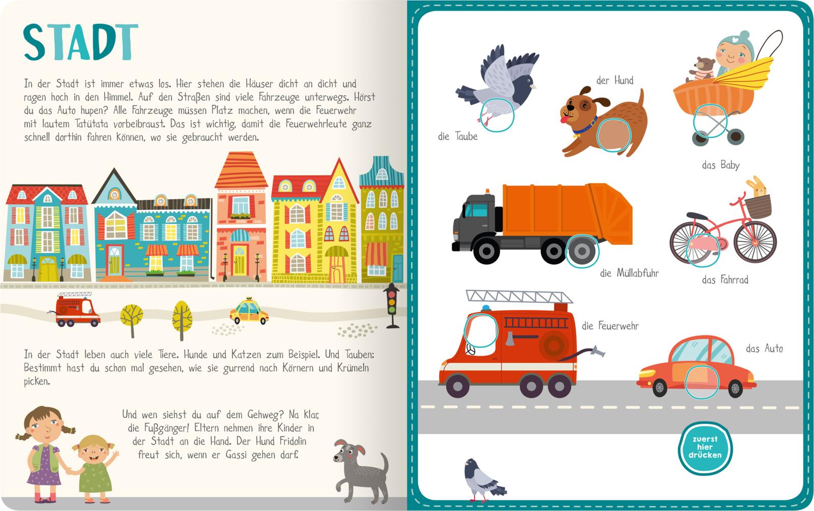 Komm mit auf den Bauernhof, in den Wald, in die Stadt, in den Garten, ins Haus, zu den Fahrzeugen und in den Zoo - und entdecke dabei allererste Wörter und Geräusche. So geht's: erst mit dem roten Button die jeweilige Themenseite aktivieren und dann auf die einzelnen Bilder drücken, um das Wort vorlesen zu lassen.