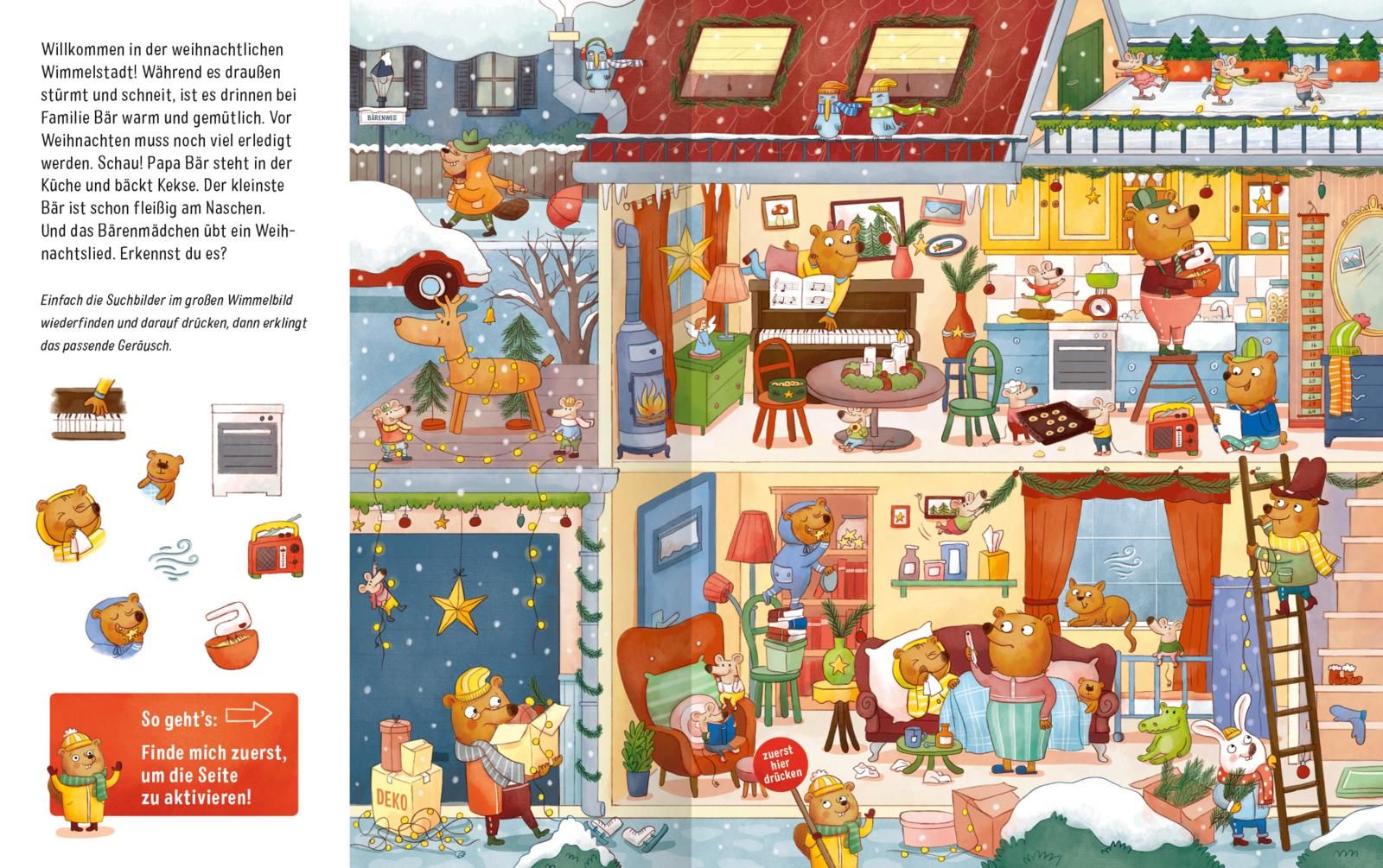 Zur Weihnachtszeit ist in der Wimmelstadt richtig was los! Begleite die lustigen Bewohner der Stadt durch ereignisreiche Wintertage voller spannender Geräusche: Für Heiligabend werden Lieder einstudiert, auf dem Weihnachtsmarkt dreht sich das Karussell, das Feuerwerk an Silvester kracht und Papa Biber hält alles mit seiner Kamera fest - klick-klick.