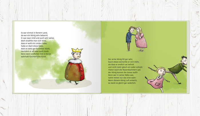 Der arme König schämt sich so sehr: Ständig muss er pupsen! Und wo immer er ist, stinkt es ganz fürchterlich. Sein Hofstaat hat zahlreiche Ratschläge, wie der König sein Leiden loswerden könne, aber alle Versuche scheitern kläglich. Schließlich zieht sich der König kummervoll in seine Burg zurück. Doch schon bald soll sich ihm die Gelegenheit bieten, wahren Heldenmut zu beweisen Eine bunt illustrierte Geschichte in Reimen voller Humor, die das Pupsen hochleben lässt!