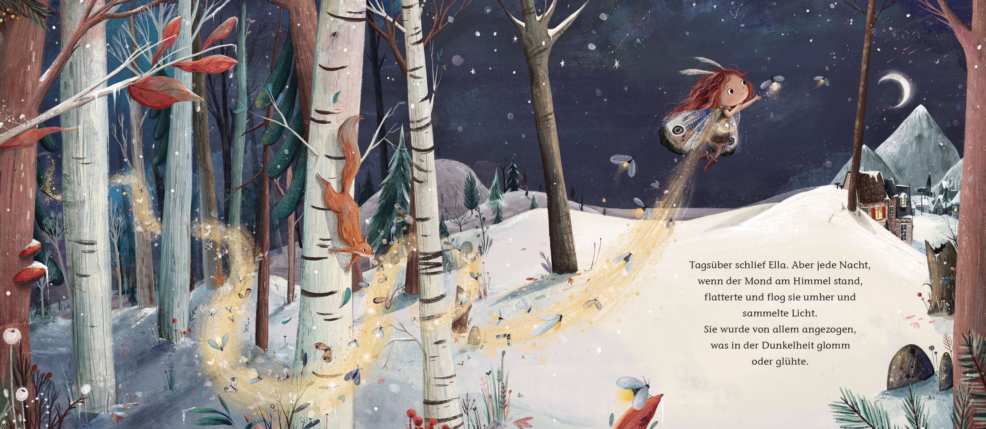 Ella Funkelfalter ist von allem fasziniert, was hell ist und leuchtet. Zu gern würde sie einmal den Sonnenaufgang erleben, doch das ist wegen ihrer empfindlichen Flügelchen viel zu gefährlich. Also sammelt Ella das Leuchten aller nächtlichen Lichtquellen und schenkt es denen, die sich vor der Dunkelheit fürchten. Aus Dankbarkeit planen Ellas Freunde eine große Überraschung ... Bilderbuch für Kinder ab 4 Jahren, das durch seine funkelnd-schönen Illustrationen bezaubert.