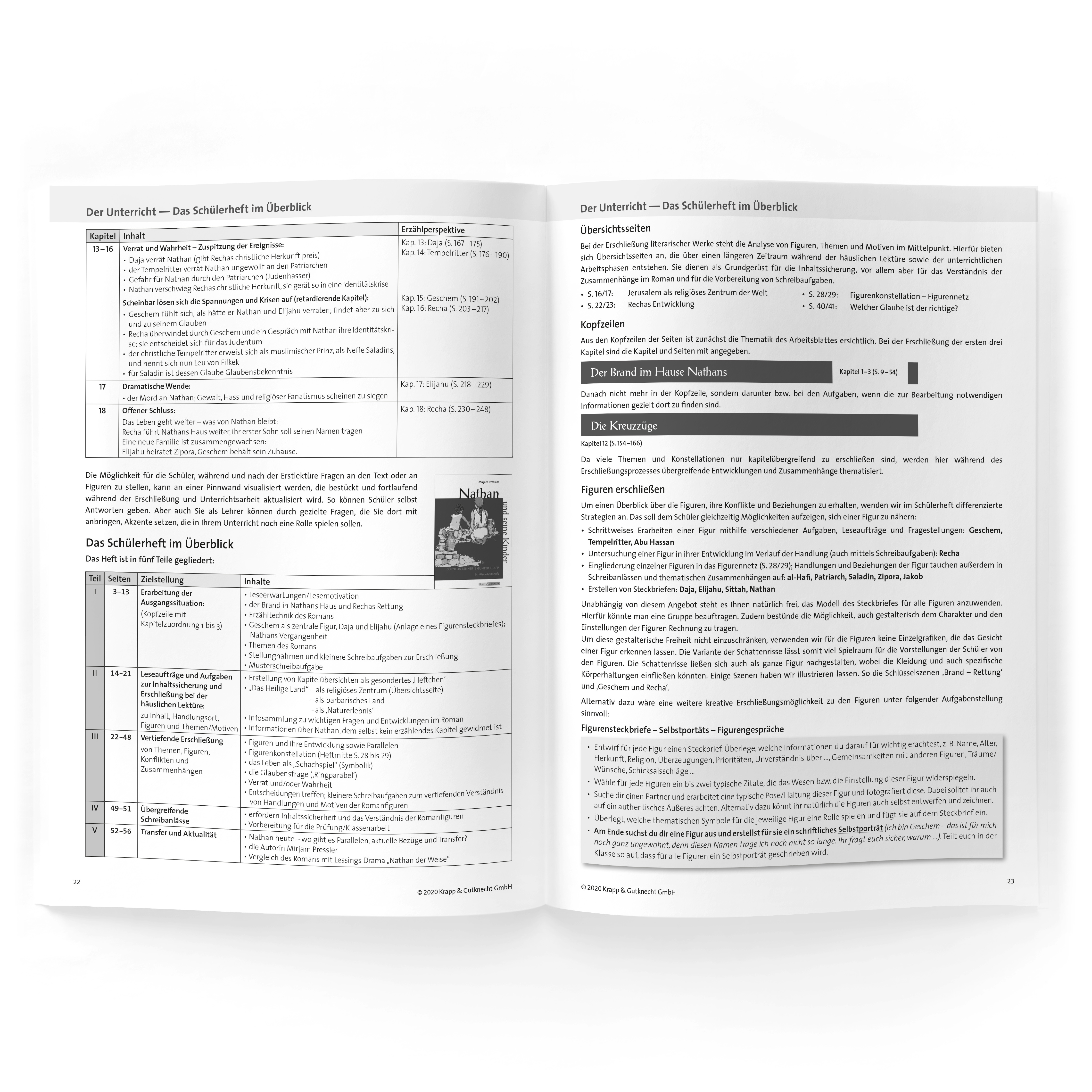 Religiöse Grenzen überwinden. Nathan, der Weise in neuem, zeitgemäß aufgearbeitetem Gewand: Der Roman lässt, als besonderen Kunstgriff, Menschen unterschiedlicher Herkunft Nathans Schicksal erzählen, das einen anderen Verlauf nimmt als in der Vorlage. Zu den bekannten Charakteren kommen neue hinzu, wie der Waisenjunge Geschem, der als Küchenjunge in Nathans Haus arbeitet, oder Abu Hassan, ein fanatischer Hauptmann des Sultans. Die schon vielfach preisgekrönte Autorin schreibt provozierend zeitgemäß, bezaubert den Leser durch die Lebendigkeit und Lebensnähe der Figuren und macht begründete Hoffnung auf eine friedliche Koexistenz der Religionen. Das Lehrerheft enthält - Ausführliche Inhalts- und Kapitelübersicht - Zeitliche Einordnung der geschichtlichen Geschehnisse - Analyse der Figuren, Themen und Motive - Unterschiede zu Lessings Nathan der Weise - Erschließungsvorschläge - Transfer und Aktualität - Übergreifende Schreibaufgaben - Strukturbilder zu zeitlichen und handlungsrelevanten Ebenen - Hinweise und Lösungen zum Schülerheft Das Schülerheft ist erhältlich unter der ISBN: 9783941206403 und enthält - Erschließungsunterstützende Schreibaufgaben (Dialog, innerer Monolog, persönlicher Brief ...), durch die die Jugendlichen Position beziehen - Das »Heilige Land« und die Kreuzfahrer - Die Ringparabel: Aussage und Aktualität - Inhalts- und Verständnissicherung - Vergleich mit dem »Original« von Lessing - Strukturgrafiken und Illustrationen zu Handlungszusammenhängen Das Denken und Handeln der Figuren, ihre moralischen Vorstellungen und auch ihr Lern- und Veränderungsprozess stehen im Mittelpunkt der Erschließungsarbeit. Das Kernthema, die Selbstbestimmung eines vernünftig denkenden und handelnden, toleranten Menschen, der Entscheidungen mit Herz und Vernunft, unabhängig von Religionszugehörigkeit, trifft, durchzieht die Auseinandersetzung mit dem Text.