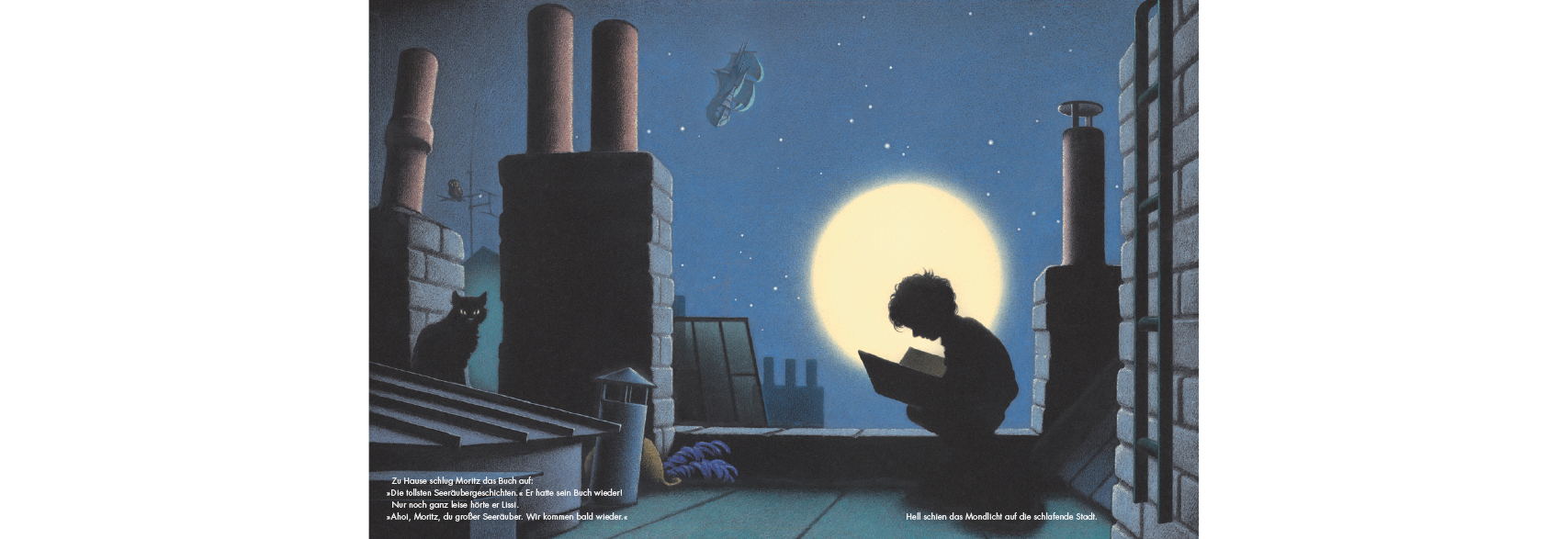 Moritz' Piratenbuch ist weg! Aber gerade als Moritz traurig träumend in die Nacht hinaus schaut, hört er Rufe. Ein Schiff schwebt aus den Wolken herab, die Mannschaft winkt ihn an Bord. Was jetzt geschieht, übertrifft alle Wünsche: Moritz segelt mit Lissi und ihren Kumpanen über Stadtlandschaften und durch Wälder. In einem Leuchtturm finden sie schließlich das Piratennest. Hier muss der Schatz sein! Doch um diesen zu bekommen, müssen sie Kapitän Grimmbart und seine Gesellen überlisten. Als Lissi nach der Heimkehr den Schatz teilt, bekommt Moritz sein Buch zurück. Glücklich setzt er sich aufs Dach und liest im Mondlicht.