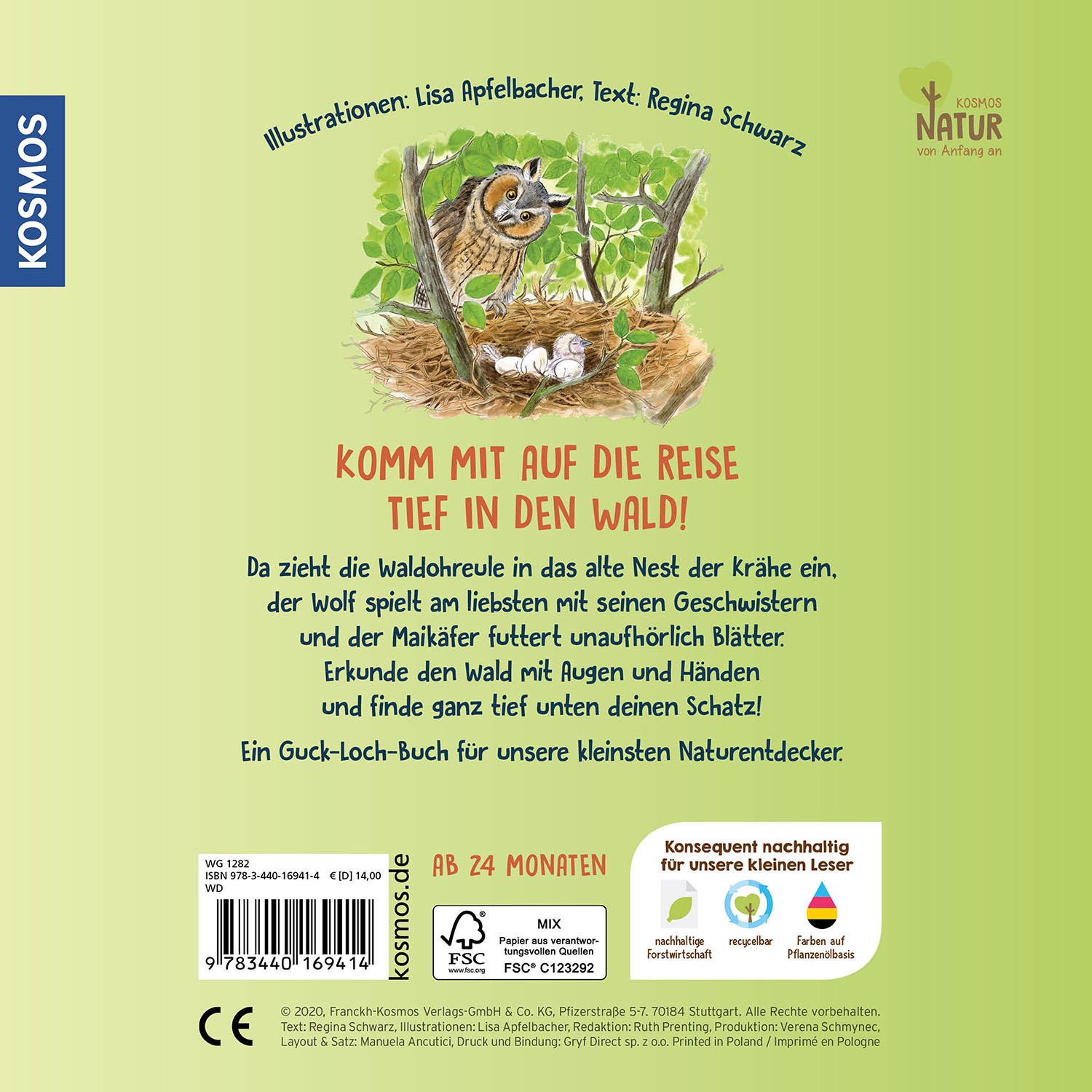 Nanu, Löcher im Buch? Ja, und zwar ganz besondere! Die Lochstanzungen lenken den Blick und die Fingerchen der Kinder in geheimnisvolle Welten. Wer oder was lebt im Wald? Mit jedem Umblättern wird der Einblick in die Lebenswelt der Bewohner unserer Wälder intensiver. Zauberhafte, naturgetreue Zeichnungen von Lisa Apfelbacher zeigen Tiere, die man sonst nicht sieht, in typischen oder lustigen Situationen, die die Kinder begeistern und sich einprägen. In charmanten Reimen von Regina Schwarz werden die Waldohreule, der Buntspecht, das Eichhörnchen, das Reh, der Wolf, das Wildschwein, der Siebenschläfer, der Maikäfer und der Tausendfüßer vorgestellt.KOSMOS Natur von Anfang an - konsequent nachhaltig.Produziert nach dem zertifizierten Cradle-to-Cradle-Prinzip.