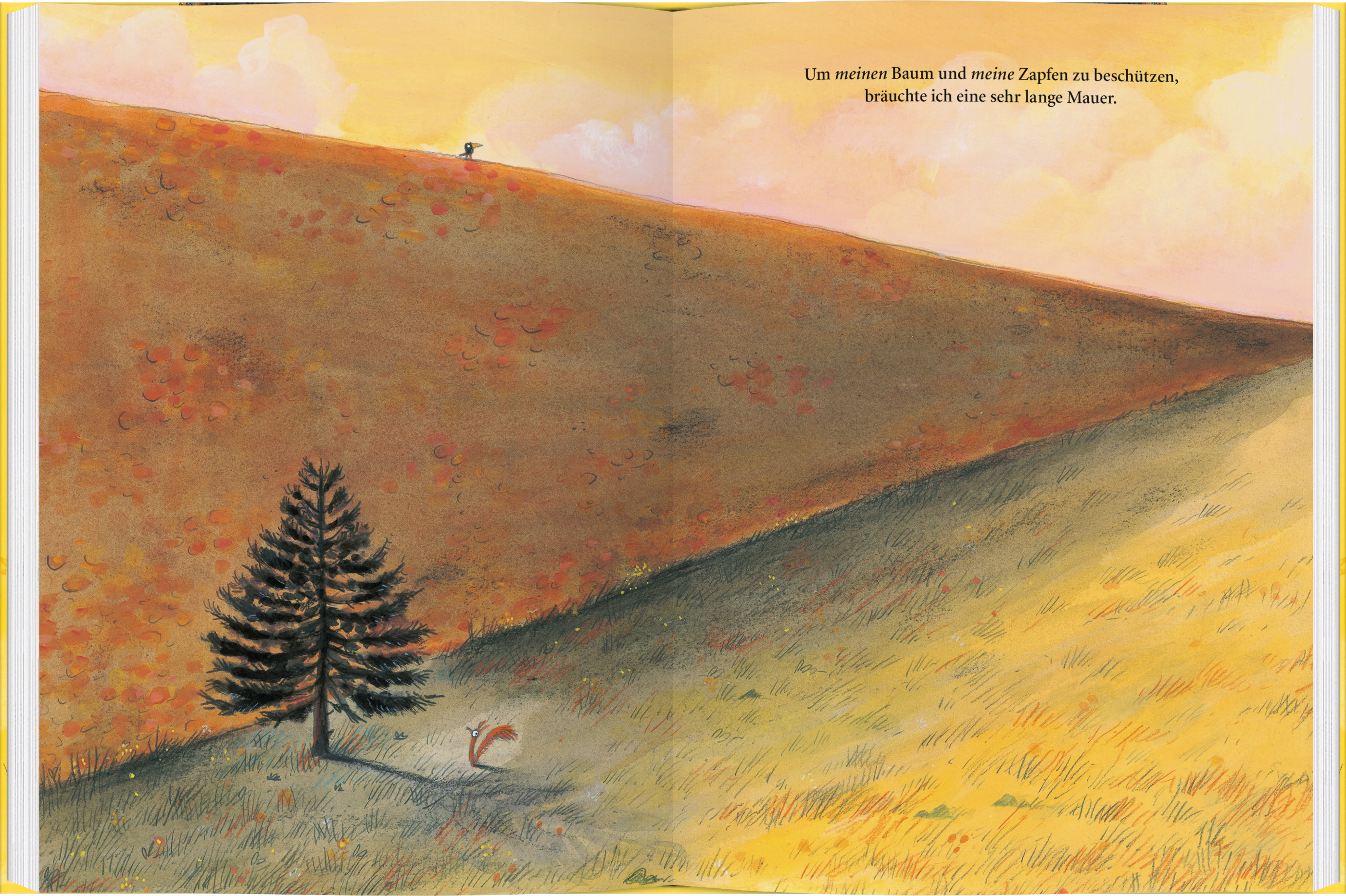 Das Eichhörnchen liebt Bäume. Und vor allen Dingen liebt es SEINEN Baum. Es liebt es, die Zapfen SEINES Baumes in dessen Schatten zu essen. Und es hält überhaupt nichts von der Idee, SEINEN Baum, dessen Schatten und dessen Zapfen mit anderen zu teilen. Aber wie schützt man seinen Baum am besten vor den anderen? Mit einem Tor? Oder einem Zaun? Oder einer Mauer? Und wie müsste diese Mauer beschaffen sein? Und wenn man dann diese riesige, schützende Mauer hätte - was ist dann eigentlich hinter dieser Mauer?