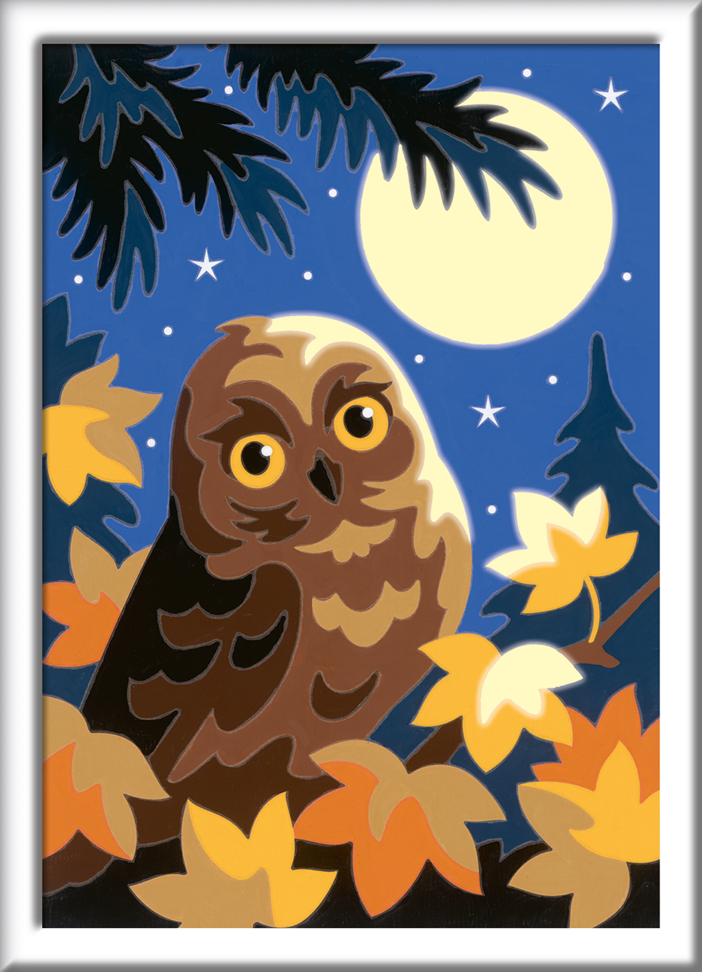 Dank der farbigen Motivlinien, können die Kinder das ganze Motiv Eule im Mondschein und die Farben schneller erkennen. Der Pinsel hat eine gute Führung und so entsteht ein perfektes Bild.
