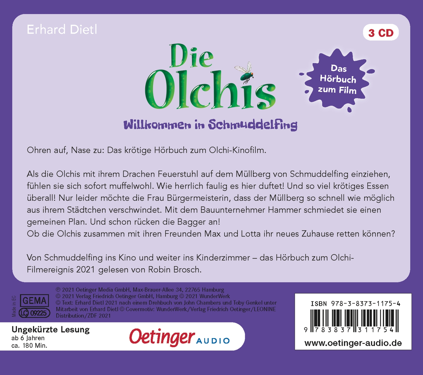 Ohren auf, Nase zu: Das muffelige Hörbuch zum Olchi-Kinofilm. Auf der Suche nach einem neuen Zuhause stürzen die Olchis mit Ihrem Drachen Feuerstuhl über Schmuddelfings Müllberg ab. Wie herrlich faulig es hier duftet! Die Olchi-Kinder fühlen sich sofort muffelwohl. Nur leider ist der Frau Bürgermeister der Müllberg ein Dorn im Auge. Sie möchte dort ein Wellness-Hotel bauen lassen. Schon rücken die Bagger an ... Ob die Olchis zusammen mit ihren Freunden Max und Lotta ihr neues Zuhause retten können? Von Schmuddelfing ins Kino und weiter ins Kinderzimmer - ungekürzte Lesung von Robin Brosch.