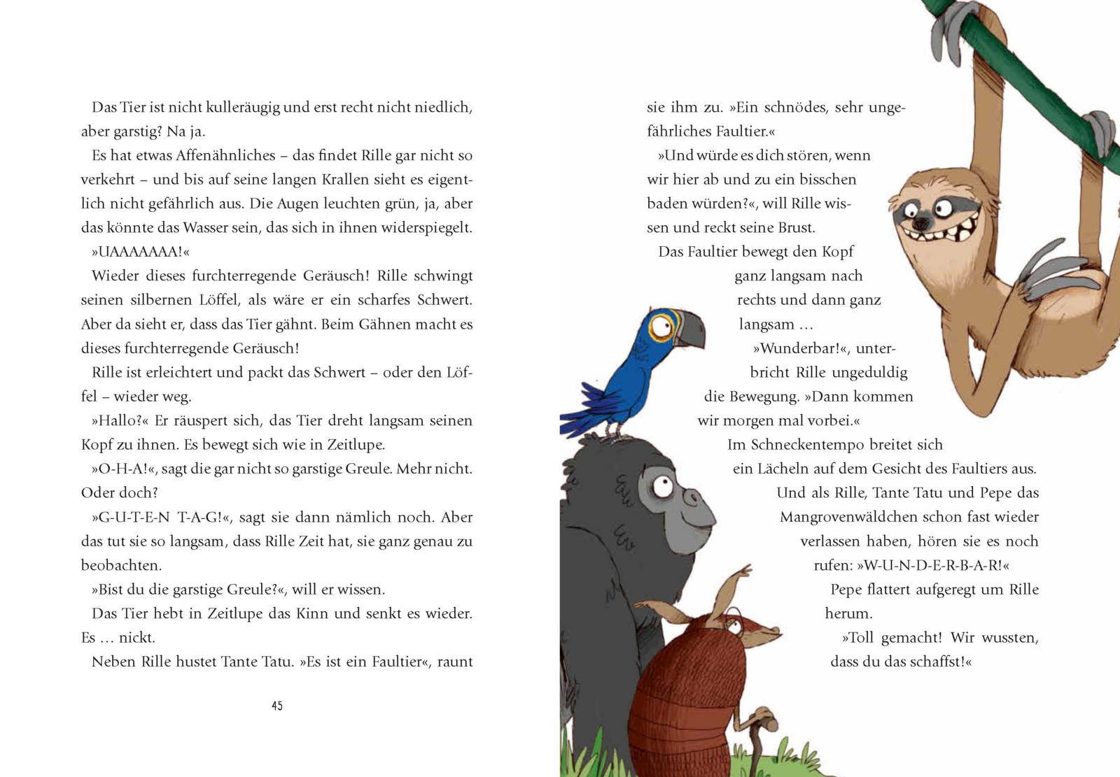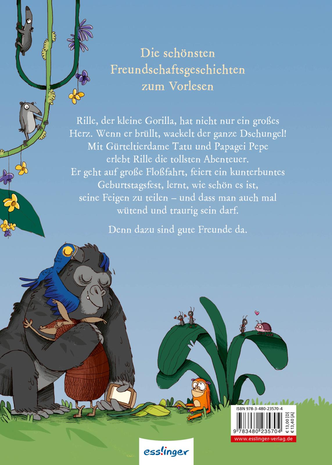 Rille, der kleine Gorilla, hat ein großes Herz. Und er kann so laut brüllen, dass der ganze Urwald wackelt. Mit seinen Freunden Gürteltier Tatu und Papagei Pepe erlebt er die tollsten Abenteuer. Er geht auf große Floßfahrt, trifft geheimnisvolle Tiere und bekommt die kuscheligsten Gutenachtgeschichten erzählt. Rille lernt, mutig zu sein, seine Feigen zu teilen. Und dass man auch mal wütend und traurig sein darf. Denn dazu sind gute Freunde da.