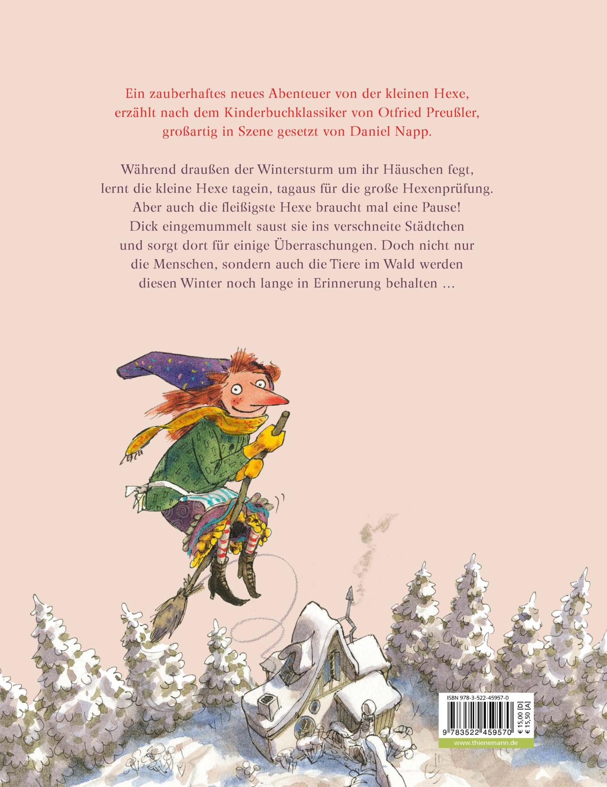 Im verschneiten Städtchen hilft die kleine Hexe dem frierenden Maronimann und feiert mit den Tieren im Wald ein zauberhaftes Winterfest.