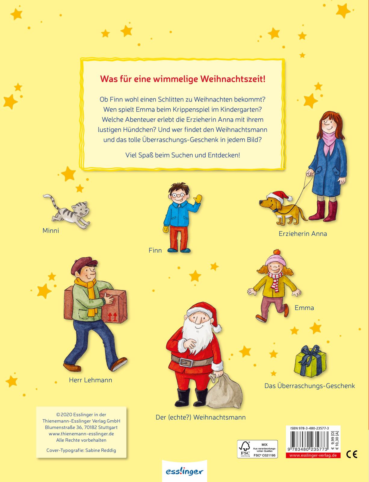 Ein Wimmelbuch rund um Weihnachten, mit vielen fortlaufenden Geschichten und extra Suchaufgaben: Ob der kleine Finn wohl einen Schlitten zu Weihnachten bekommt? Wen spielt Emma beim Krippenspiel im Kindergarten? Welche Abenteuer erlebt die Erzieherin Anna mit ihrem lustigen Hündchen auf dem Weihnachtsmarkt und beim Schneemannbauen? Und wer findet den Weihnachtsmann und das tolle Überraschungs-Geschenk in jedem Bild?