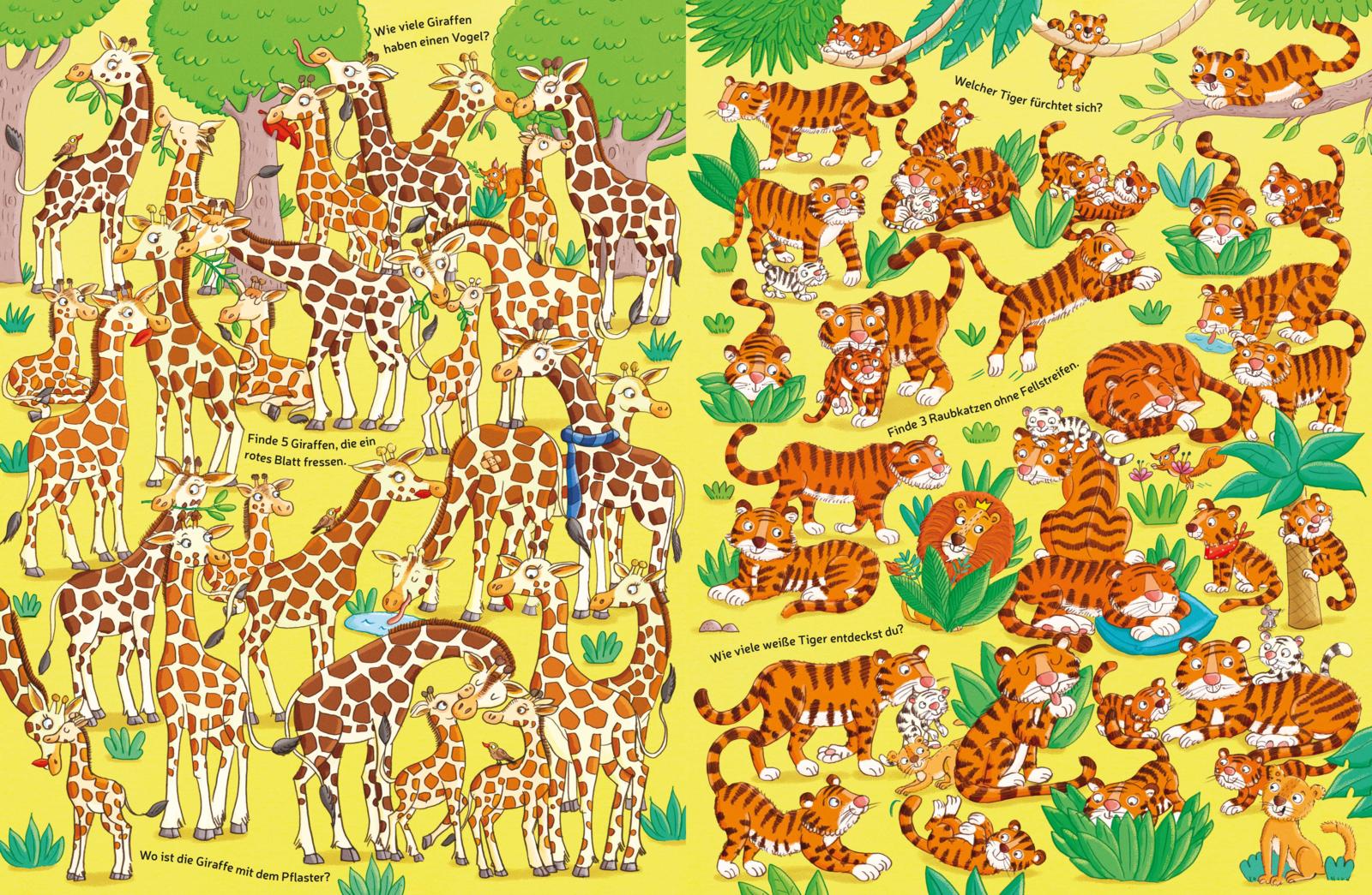 In diesem Wimmelbuch ist tierisch was los! Suchen, Zählen, Vergleichen, Entdecken - wer genau hinschaut, kann alle Fragen und Aufgaben lösen: Wie viele Katzen haben ein schwarzes Ohr? Wo ist die Giraffe mit dem Pflaster? Finde drei Biber mit Badehose!