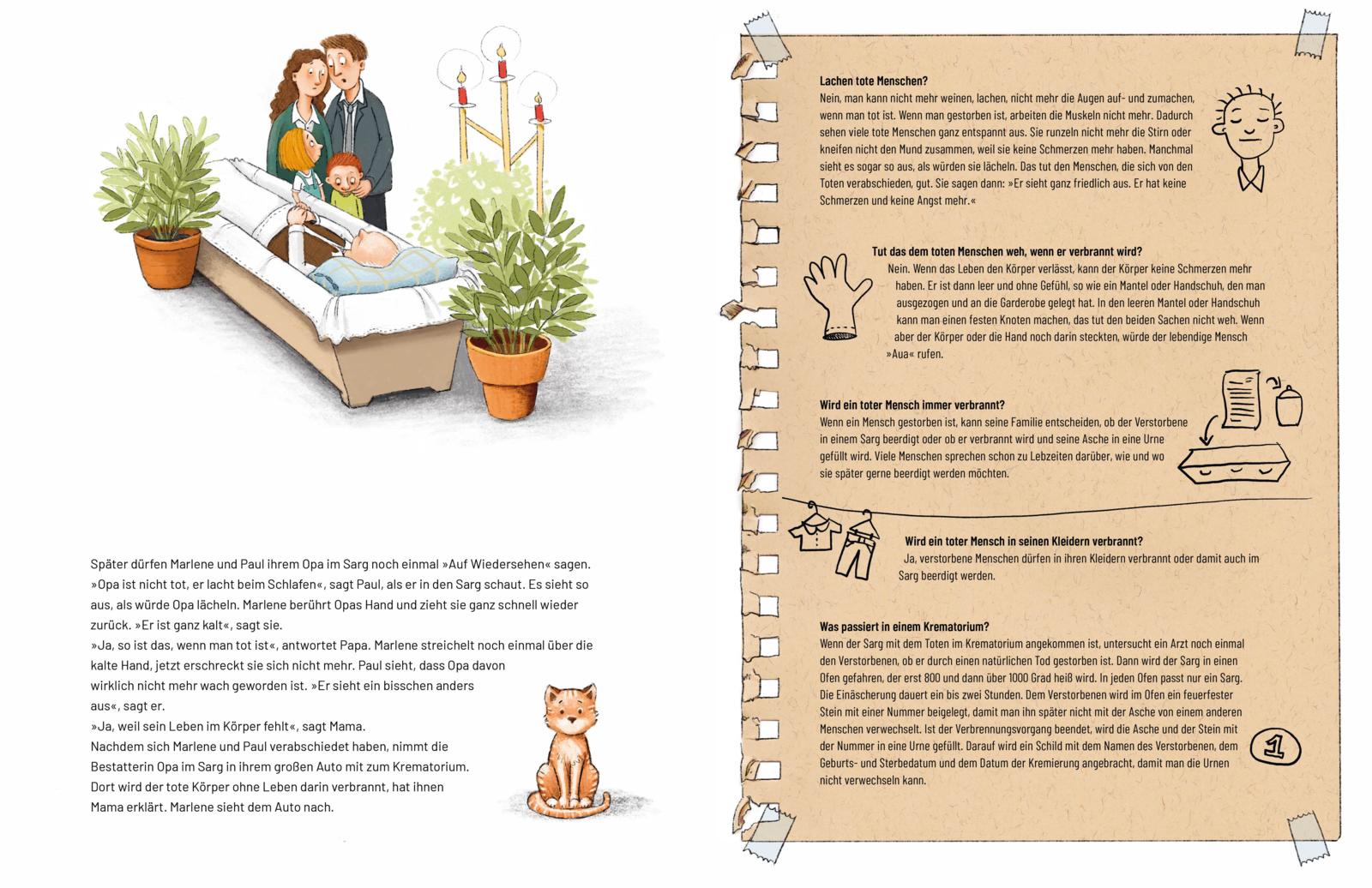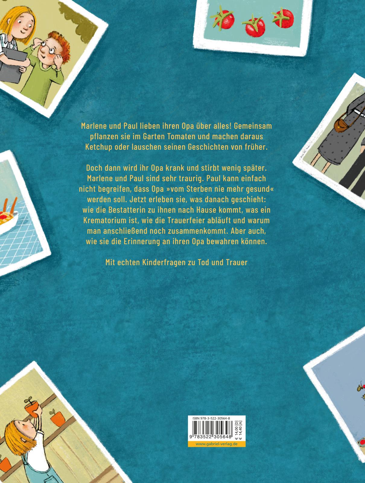 Marlene und Paul lieben ihren Opa über alles, auch wenn sie nicht mehr zusammen mit ihm Tomaten pflanzen und daraus Ketchup machen können. Jetzt ist er sehr schwach. Wenig später stirbt er und die Kinder erleben, was danach passiert: wie der Bestatter zu ihnen nach Hause kommt, was im Krematorium passiert, wie die Beerdigung abläuft, warum man anschließend noch zusammenkommt. Aber auch, wie sie die Erinnerung an ihn bewahren können.