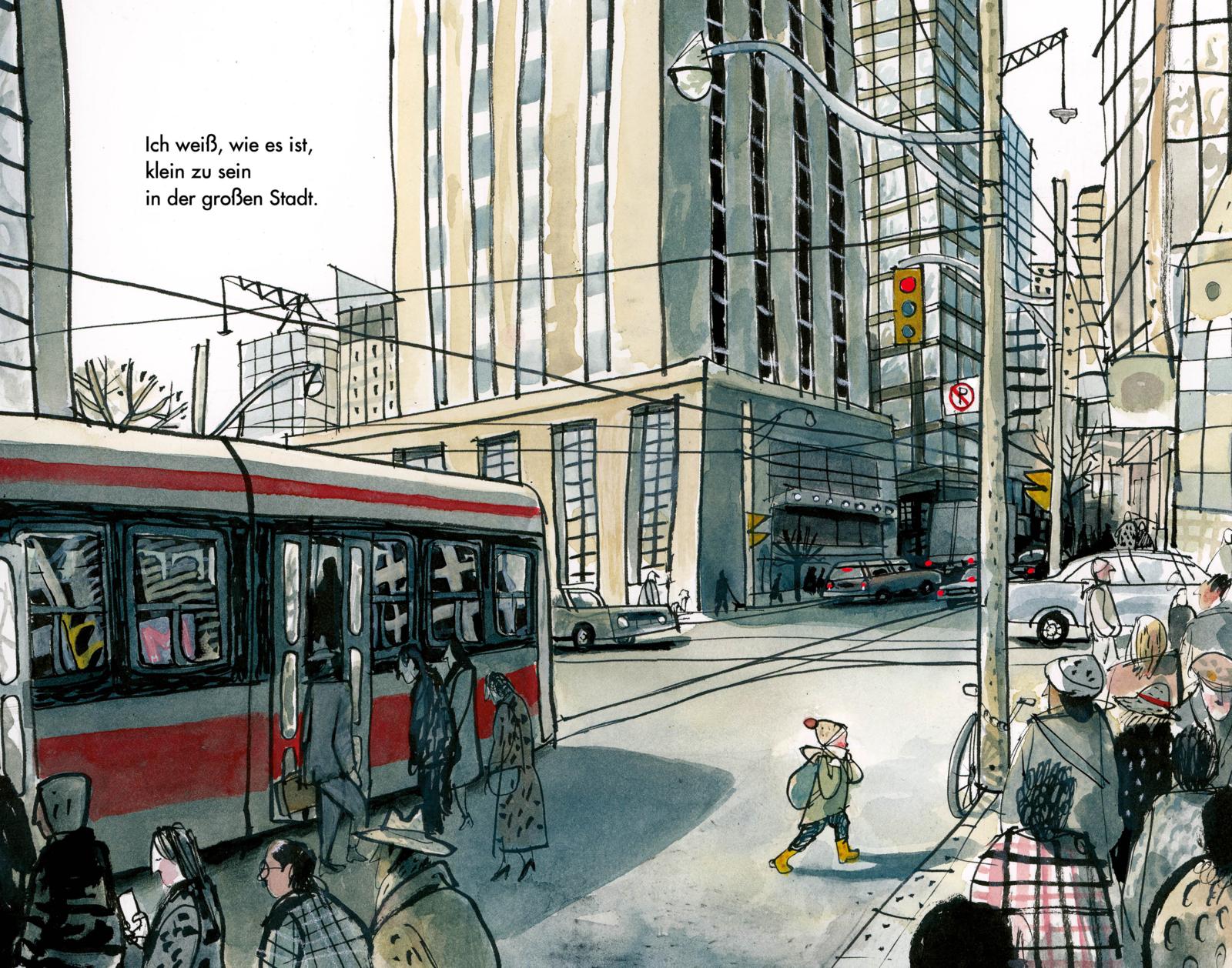 "Sydney Smith hat ein Meisterwerk der Bilderbuchkunst geschaffen, zum ersten Mal als Autor und Illustrator. Virtuos nutzt er eine Fülle an Gestaltungsmöglichkeiten. Kaleidoskopartig spiegeln die Bildformate die vielen Eindrücke. Pinselstrich und pointiert eingesetzte Farbigkeit inmitten von Weiß, Schwarz und Grauschattierungen schaffen eine Atmosphäre, die man mit allen Sinnen wahrzunehmen scheint. Manche Andeutung versteht man erst Seiten später, blättert zurück, wird zum wiederholten Anschauen angeregt. Ein ermutigendes Bilderbuch – es zeigt auf künstlerisch beeindruckendem Niveau, dass Kinder auch in schwierigen Situationen selbständig und zuversichtlich denken und handeln können."