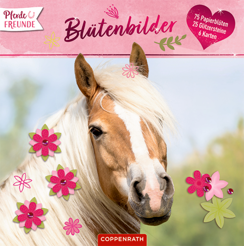 Dieses Bastel-Set enthält: 6 Karten mit wunderschönen Pferdefotos, 75 farbige Papierblüten, 25 pinkfarbene Glitzersteinchen. Pferdefreunde zaubern sich daraus ein hübsches Papierblütenkunstwerk: zunächst ein Bild auswählen, dann pro Blume drei verschiedene Papierblüten auswählen, nach Größe geordnet übereinander legen (erst grün, dann rosa, dann pink), mit wenig flüssigem Klebstoff zusammenkleben und mit einem Glitzersteinchen in der Mitte verzieren. Fertig!