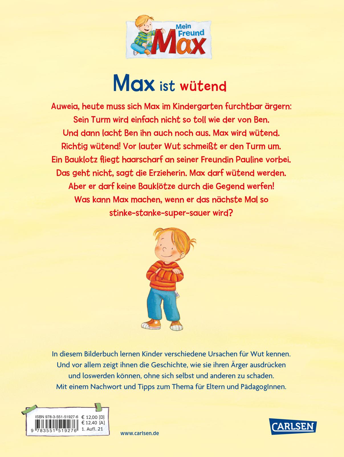 Heute muss sich Max im Kindergarten furchtbar ärgern: Sein Turm wird einfach nicht so toll wie der von Ben. Und dann lacht Ben ihn auch noch aus. Max wird wütend. Richtig wütend! Vor lauter Wut schmeißt er den Turm um. Ein Bauklotz fliegt haarscharf an seiner besten Freundin Pauline vorbei.