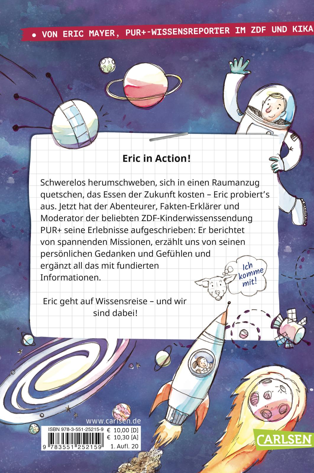 Eric in Action! Für die beliebte ZDF-Kinderwissenssendung PUR+ hat Eric einen Parabelflug überstanden, das Essen der Zukunft probiert, sich in einen Raumanzug gequetscht und vieles mehr. Eric probiert's aus und geht der Eroberung des Weltalls auf den Grund!