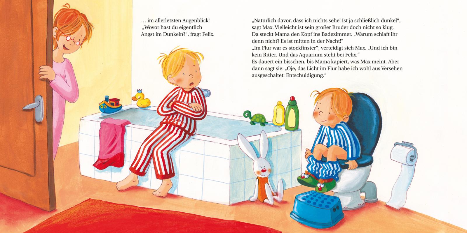 Normalerweise bleibt das Flurlicht bei Max zuhause nachts immer an. Aber ausgerechnet heute, als Max ganz dringend Pipi muss, ist das Licht aus! Es ist stockfinster im Flur. Und der Lichtschalter ist so weit weg. Max hat Angst. Aber zum Glück weiß er sich zu helfen!