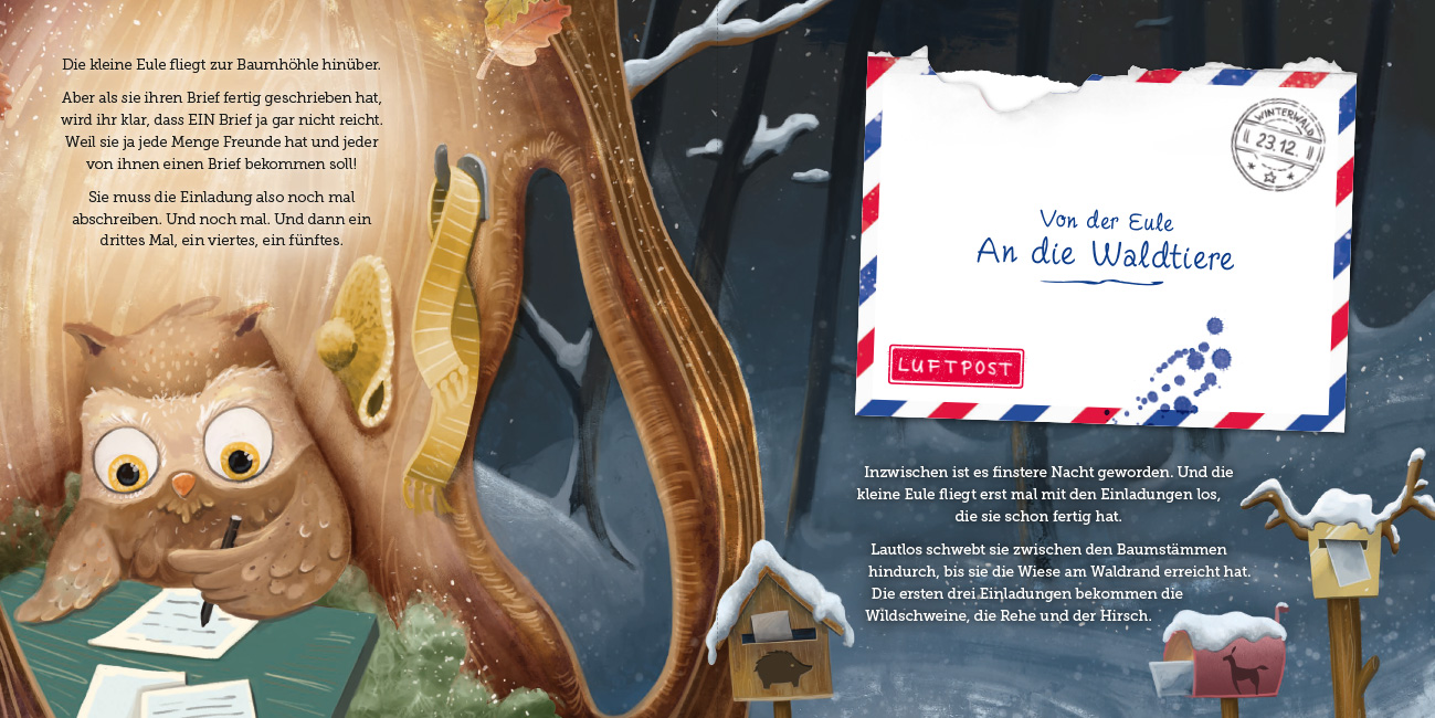 Weihnachten naht, und die kleine Eule möchte alle ihre Freunde aus dem Wald einladen, um gemeinsam mit ihnen zu feiern. Voller Vorfreude verschickt sie an jeden eine Einladung, doch niemand scheint Zeit zu haben. Der Hirsch hat Schnupfen, der Fuchs und der Hase haben sich zerstritten, und die Wildschweine wollen den Weihnachtsabend lieber dazu nutzen, die Gärten im Dorf zu verwüsten. Doch die kleine Eule hofft weiter, denn immerhin haben noch nicht alle Gäste geantwortet. Und so bereitet sie alles für das große Fest vor - oder wird es am Ende doch nur ein kleines Fest? Am Weihnachtsabend gibt es dann eine große Überraschung für die kleine Eule - und das Weihnachtsfest wird so schön wie nie zuvor. Eine zauberhafte Weihnachtsgeschichte mit fünf echten Briefen zum Herausnehmen!